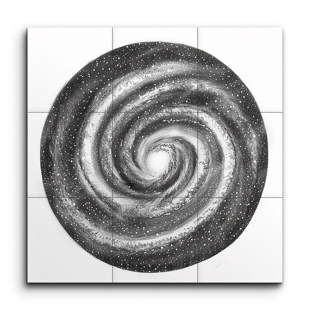 Transformez votre espace avec cette magnifique fresque en carreaux qui capture la beauté fascinante d'une galaxie spirale. Réalisée dans une palette monochromatique de noir, blanc et gris, l'œuvre met en valeur les détails complexes des bras spiraux de la galaxie se tordant vers un noyau central radieux. Les particules et les points texturés suggèrent des étoiles éparpillées, créant un sens de profondeur et de mouvement. Avec son énergie dynamique et sa qualité intemporelle, presque photographique, cette fresque offre un point focal captivant qui évoque l'immensité du cosmos.