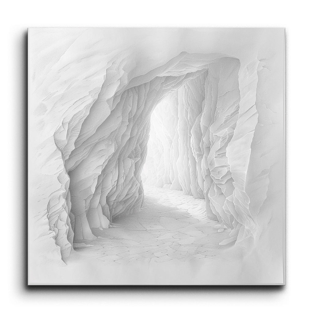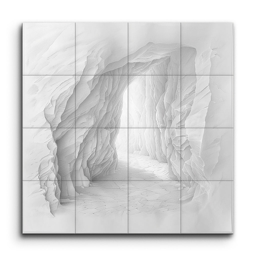 Plongez-vous dans les profondeurs captivantes de cette magnifique fresque en carreaux, représentant une entrée de grotte détaillée et complexe. Réalisée dans une palette monochromatique, l'œuvre met en valeur la texture rugueuse et la profondeur des surfaces rocheuses de la grotte avec un réalisme remarquable. Des formations rocheuses en couches et dentelées racontent une histoire d'érosion naturelle et d'histoire géologique, tandis que des ombres et des reflets habiles créent un effet tridimensionnel fascinant. Une source de lumière intérieure projette des ombres douces, ajoutant de la profondeur et un sentiment de mystère, vous invitant à explorer les merveilles cachées à l'intérieur.