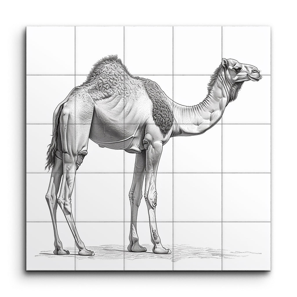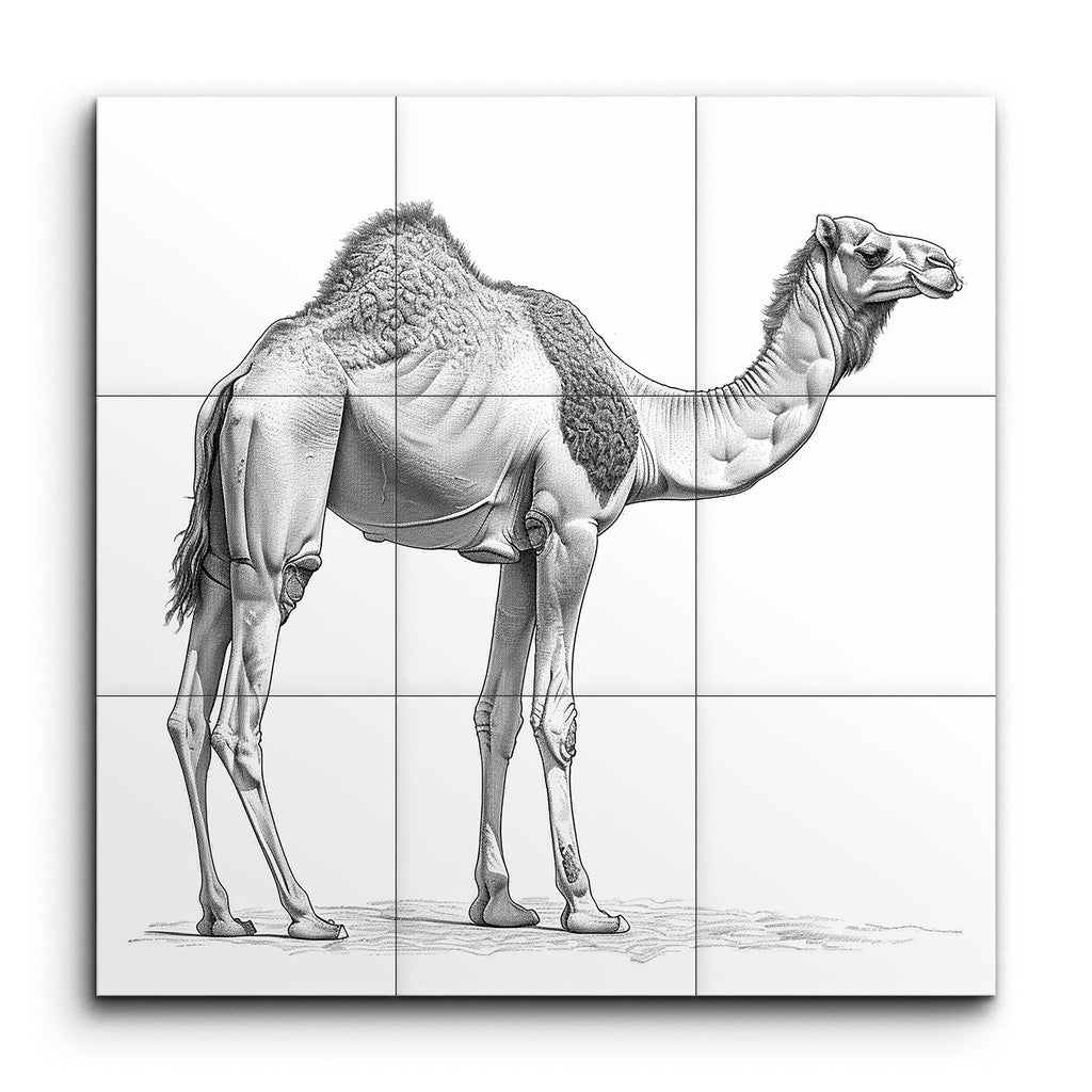 Plongez-vous dans la beauté complexe de cette fresque en carreaux, présentant une représentation réaliste d'un chameau. Capturé de profil, le chameau se tient avec la tête légèrement tournée vers la droite, mettant en valeur ses textures finement détaillées. Le contraste entre le pelage court et lisse de son cou et le pelage plus long et bouclé de sa bosse est méticuleusement rendu. Avec un accent sur l'exactitude et la profondeur, cette œuvre monochrome donne vie à la structure physique et à la force du chameau, rappelant les illustrations scientifiques classiques.