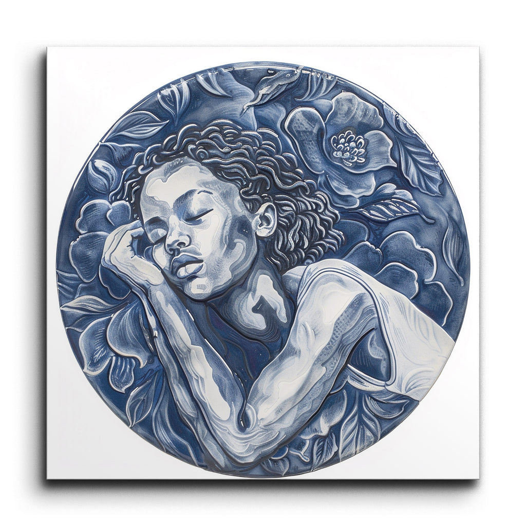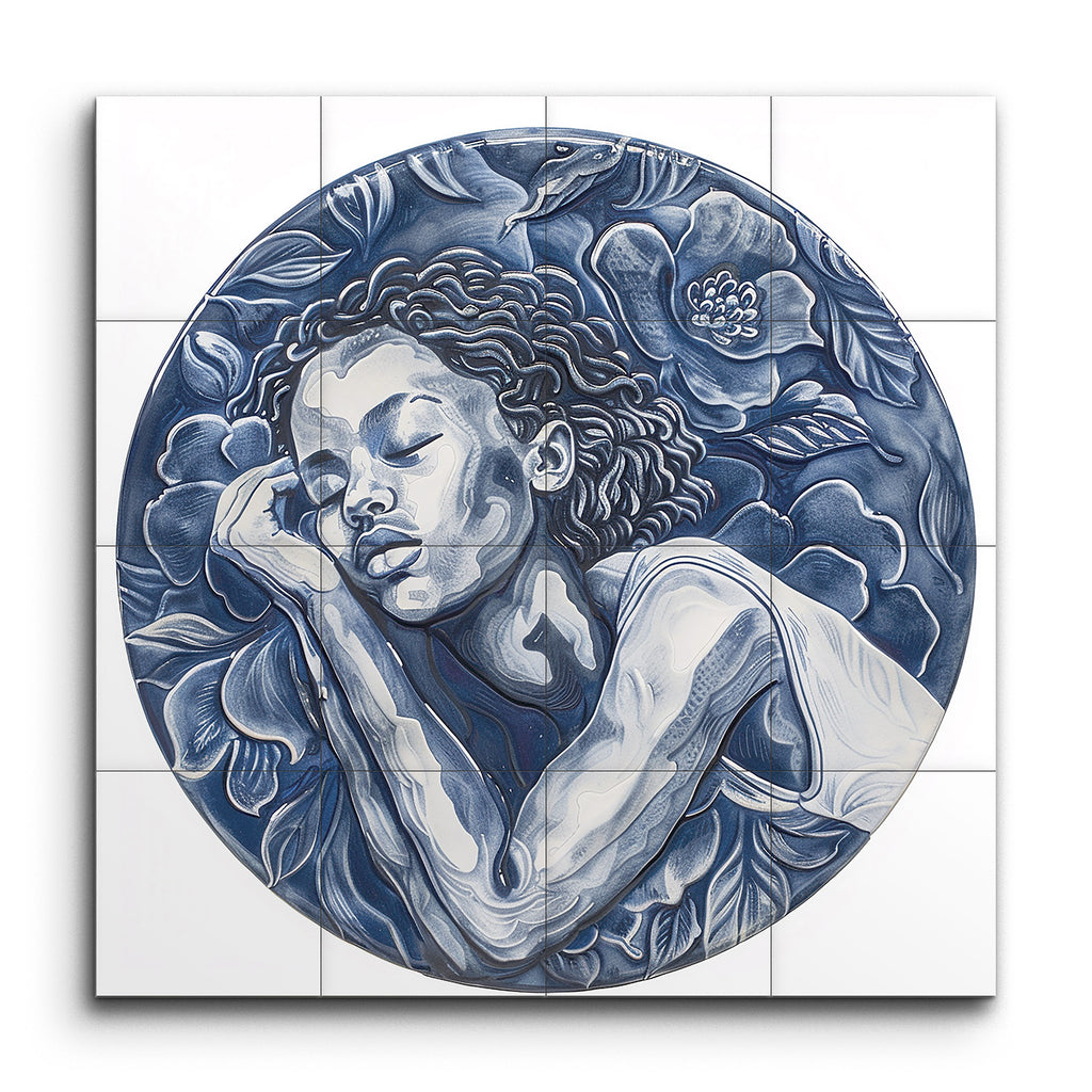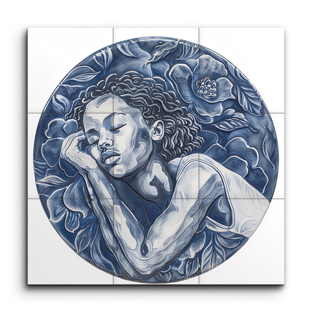 Imprégnez-vous de la tranquillité avec notre magnifique fresque en carreaux, présentant une composition circulaire sereine. Au centre se trouve une figure paisible, les yeux fermés, reposant sa tête sur son bras. La représentation détaillée de la personne, avec des cheveux bouclés et un haut sans manches dans des nuances de bleu et de blanc, évoque un état de profonde réflexion ou de contemplation reposante. Autour d'eux, des motifs floraux complexes et des éléments botaniques dans des nuances de bleu variées créent un arrière-plan luxuriant et harmonieux. La palette monochromatique unifie l'œuvre, offrant une expérience visuelle calme et cohérente.