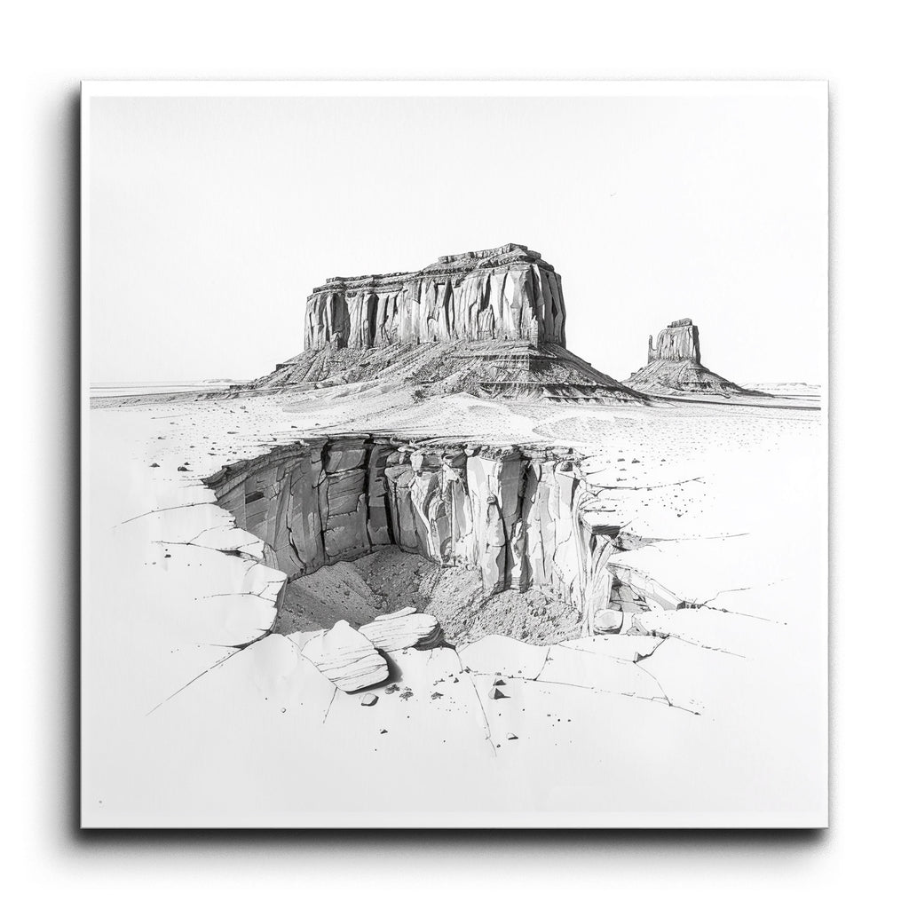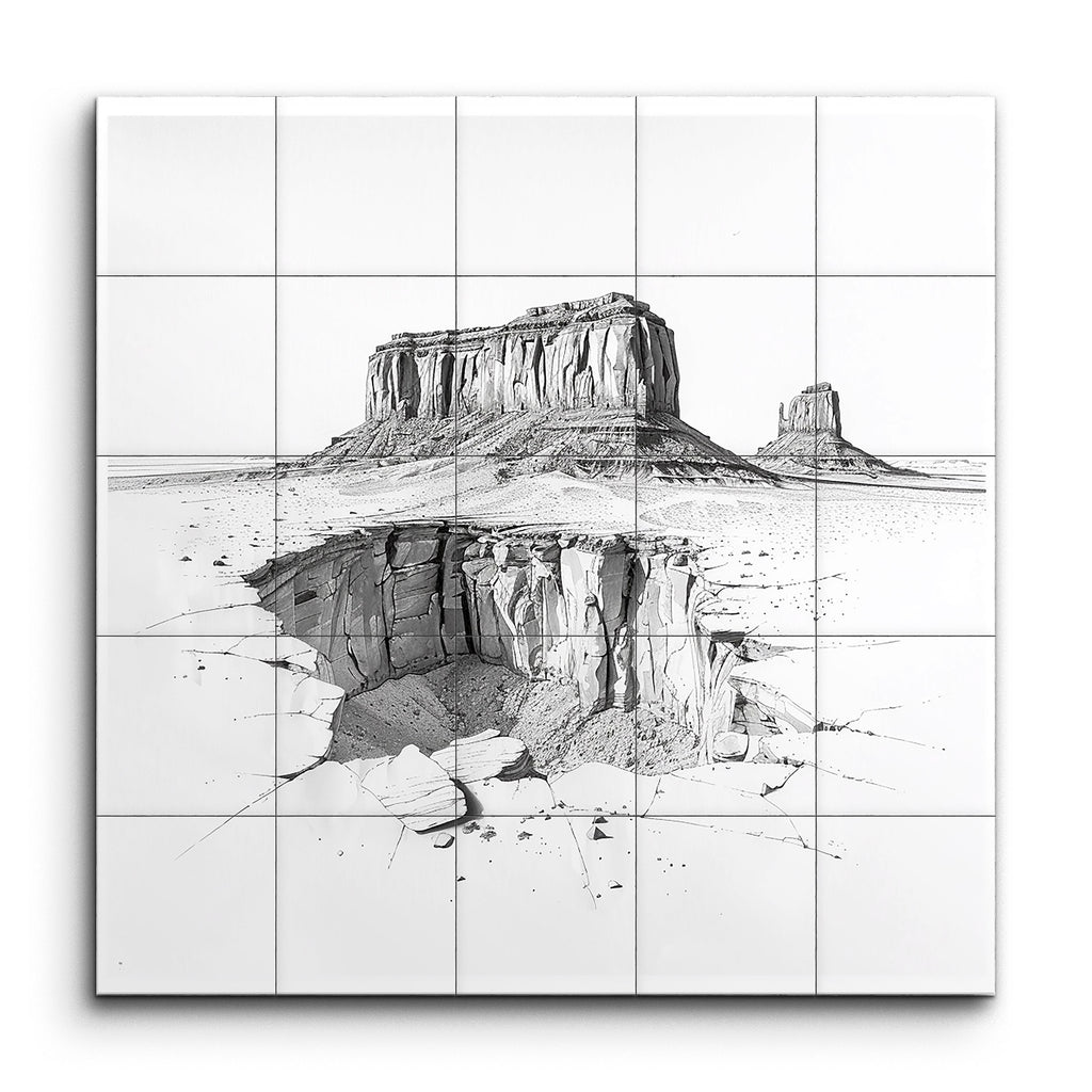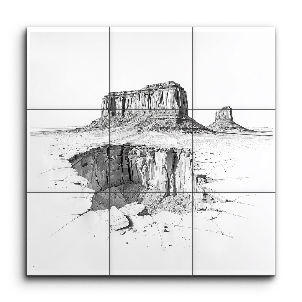 Plongez-vous dans la beauté saisissante d'un paysage désertique avec cette magnifique fresque en carreaux. L'œuvre d'art capture une scène à couper le souffle dans un détail noir et blanc méticuleux, mettant en avant un cratère proéminent et déchiqueté au premier plan qui révèle des couches de roche stratifiées fascinantes. Une mesa imposante domine le milieu du paysage avec ses falaises verticales abruptes, tandis qu'une mesa plus petite à l'arrière-plan ajoute de la profondeur et de l'échelle. Le travail de ligne précis et les techniques d'ombrage expertes créent un effet tridimensionnel captivant, soulignant l'attrait désolé mais fascinant du désert.