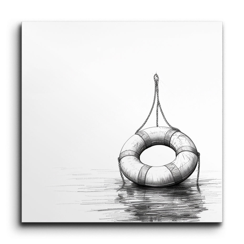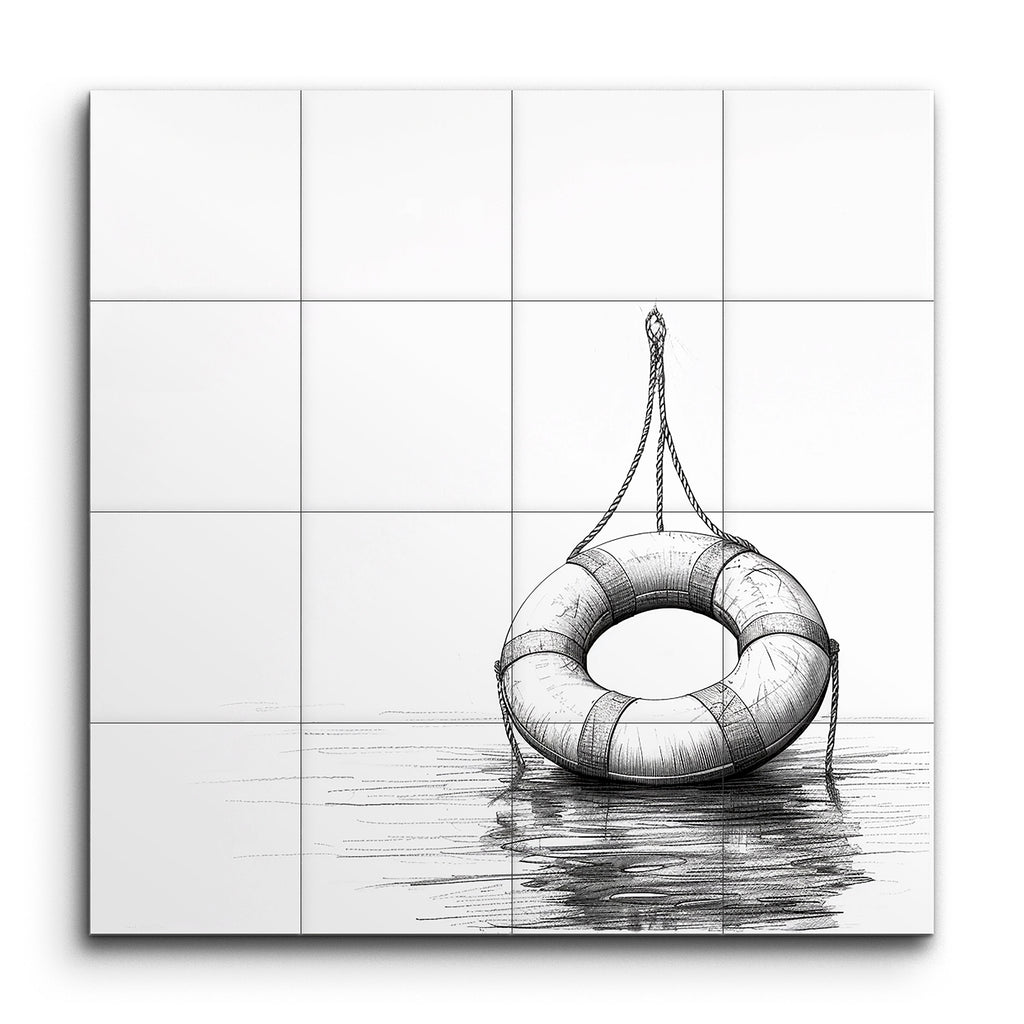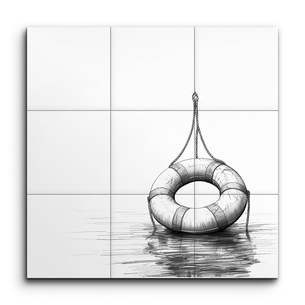 Ajoutez une touche d'élégance sereine à votre espace avec cette magnifique fresque en carrelage présentant un croquis détaillé d'une bouée de sauvetage flottant sur l'eau. Le travail de ligne méticuleux met en valeur la forme circulaire de la bouée et sa surface texturée, tandis que la corde attachée suggère une connexion à quelque chose au-delà du cadre. Le style minimaliste et monochrome utilise des lignes fines et des ombres subtiles pour créer une surface d'eau réfléchissante, capturant l'ombre de la bouée et des ondulations douces, évoquant un sentiment de calme et de solitude.