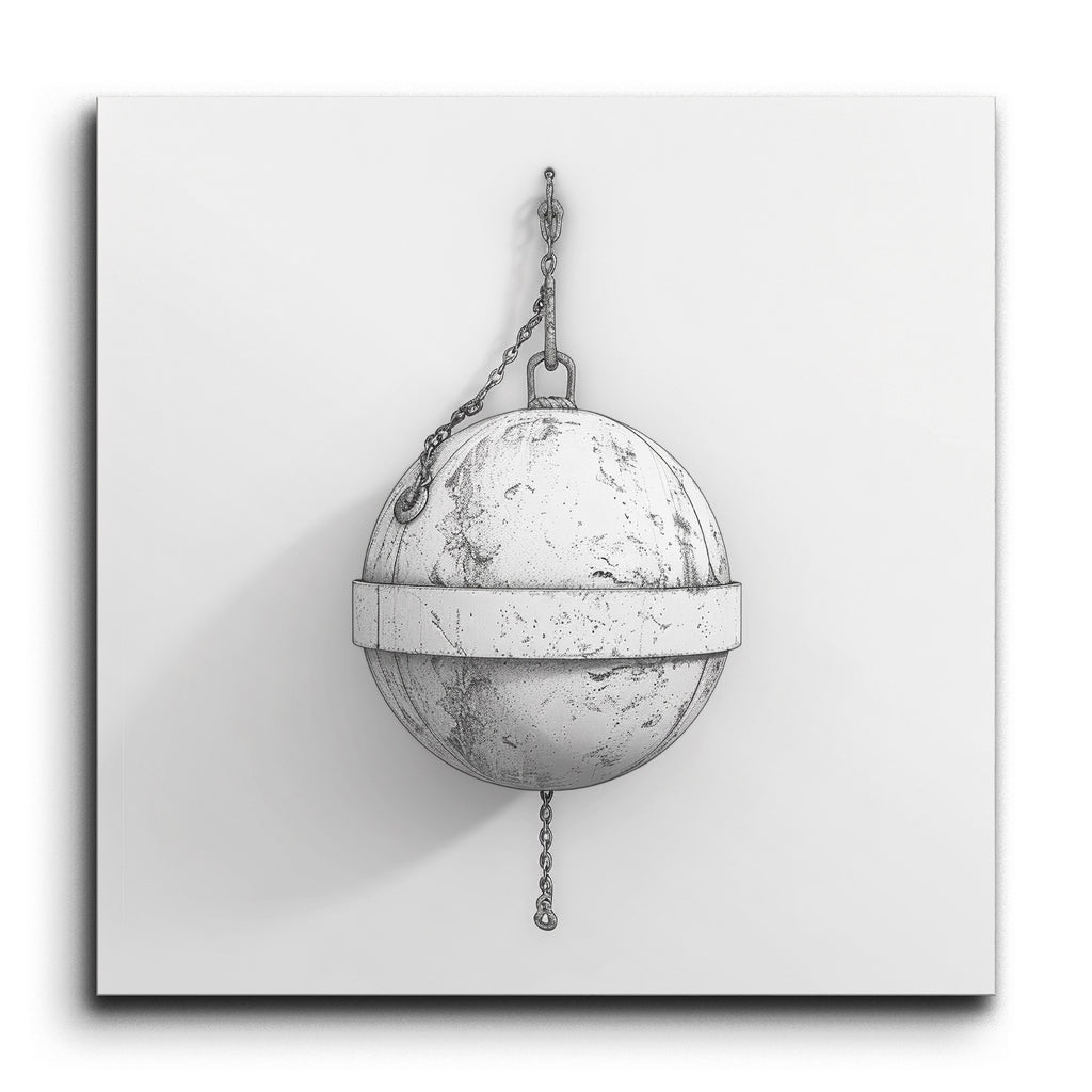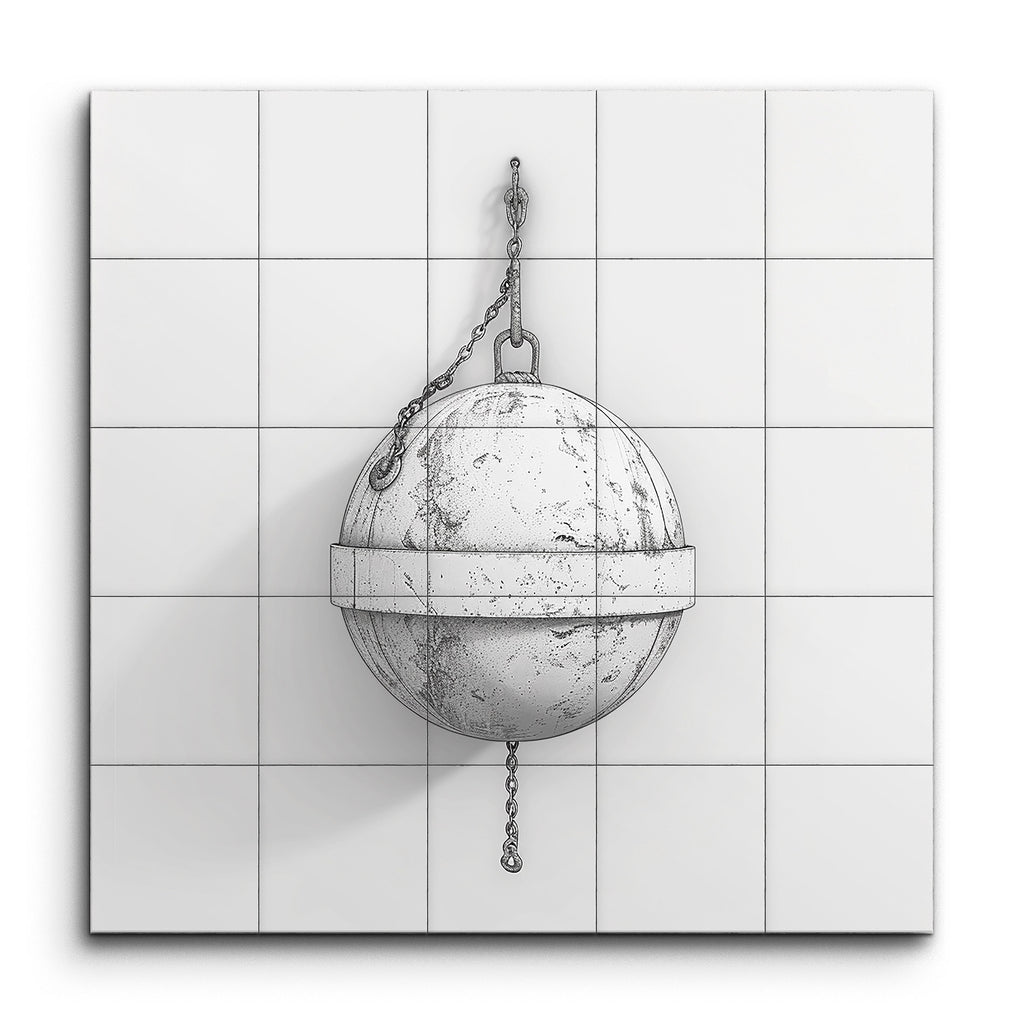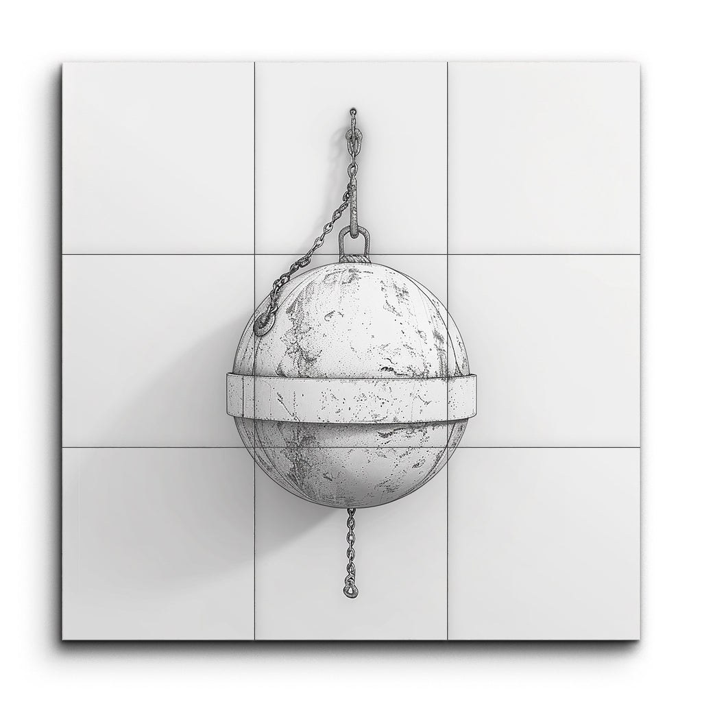 Immergez votre espace dans l'élégance industrielle avec cette captivante fresque de carreaux. L'œuvre présente une bouée usée, détaillée avec une surface texturée qui raconte une histoire de temps et de résistance. Une épaisse bande entoure son milieu, tandis qu'une chaîne s'étend du haut, suggérant une existence ancrée. Des nuances monochromatiques de gris et des lignes précises évoquent une qualité de plan, mélangeant esthétique minimaliste avec une touche de réalisme. Parfait pour ajouter un élément fonctionnel mais visuellement frappant à n'importe quelle pièce.