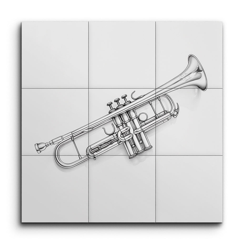Élevez votre espace avec une magnifique fresque en carreaux mettant en avant une illustration monochromatique méticuleusement détaillée d'une trompette. Réalisée dans des nuances de gris, cette œuvre d'art capture l'éclat métallique et les détails complexes de l'instrument avec un réalisme saisissant. Le design minimaliste souligne la forme élégante de la trompette, avec des lignes nettes et des proportions équilibrées qui mettent en valeur ses contours et ses courbes, créant une pièce sophistiquée et intemporelle parfaite pour tout amateur de musique Décor.