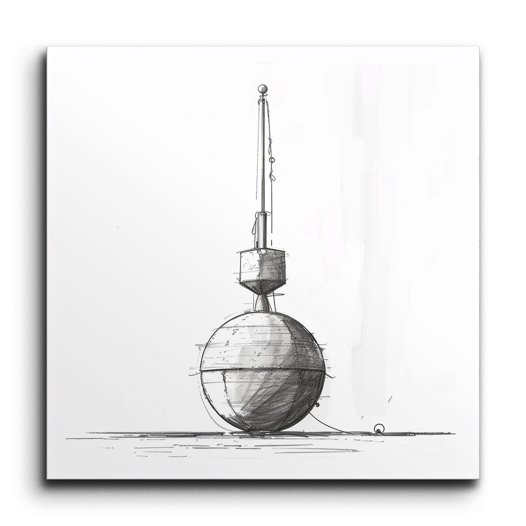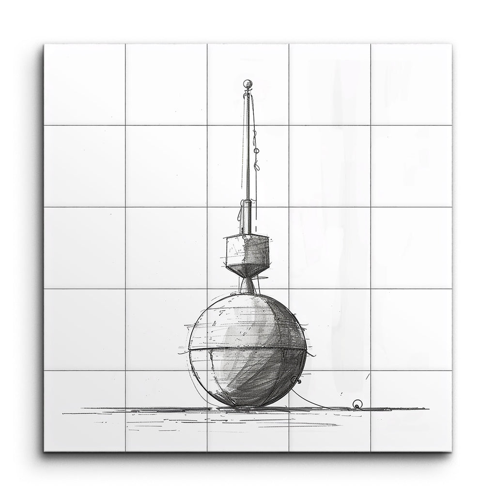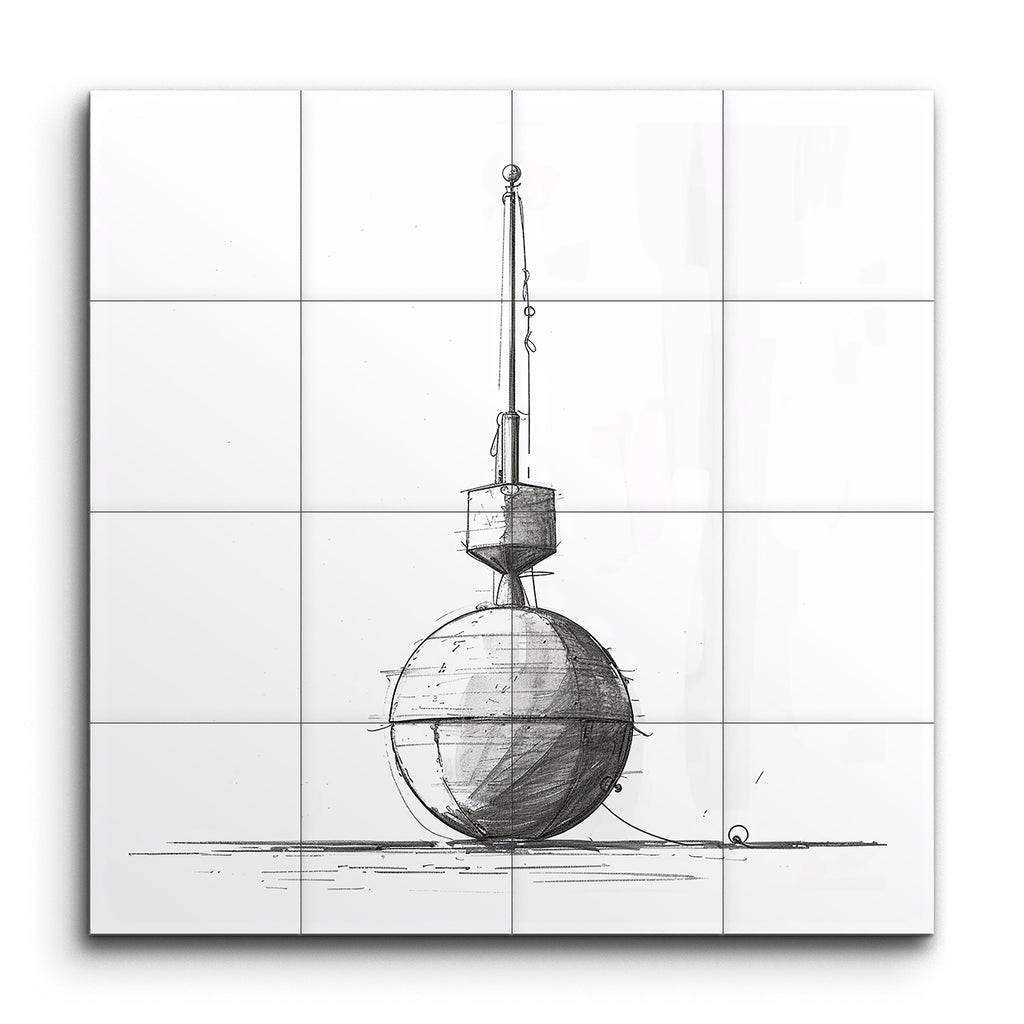 Élevez votre espace avec cette fascinante fresque en carreaux présentant un croquis minimaliste et monochromatique d'élégance géométrique. Une grande sphère repose sur une surface plane, couronnée par un petit cylindre et une tige longue et fine se terminant par une sphère délicate. Les lignes nettes et précises évoquent une sensation architecturale, adoucie par une qualité dessinée à la main. Des détails subtils comme une fine corde et un petit objet circulaire ajoutent de la complexité, créant un équilibre harmonieux qui attire le regard et stimule l'imagination.