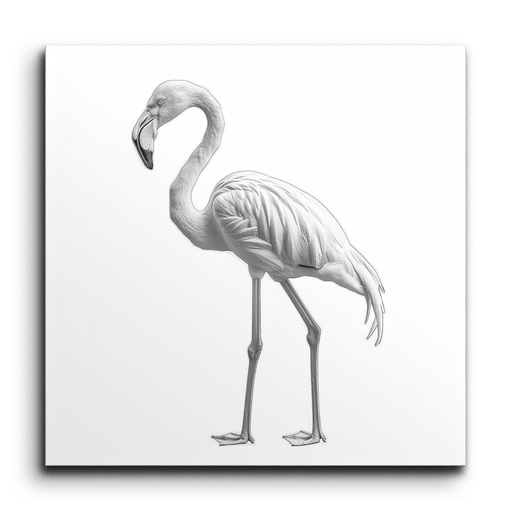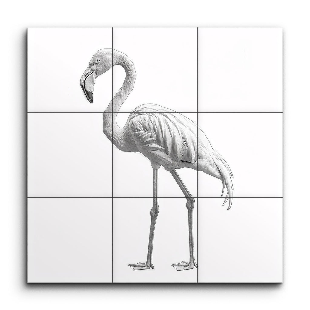 Élevez votre espace avec cette magnifique fresque de carreaux monochromes, présentant une illustration soigneusement détaillée d'un flamant rose. Capturé dans un profil latéral gracieux, le flamant se tient élégamment sur une jambe, son long cou courbé et son bec distinctif rendus avec une précision exquise. L'ombrage magistral de l'artiste et le travail de ligne fine donnent vie aux plumes et aux pattes palmées, créant un effet tridimensionnel qui met en valeur la beauté naturelle de l'oiseau. Cette œuvre d'art réaliste et intemporelle exhale élégance et sophistication.