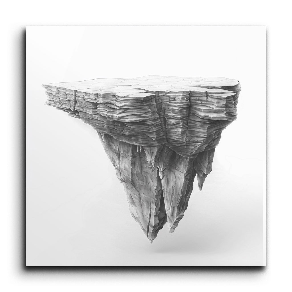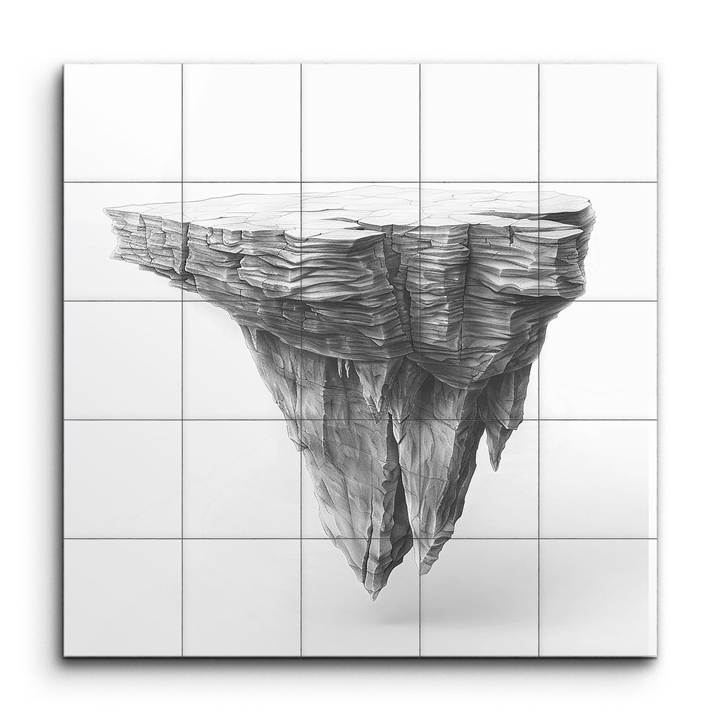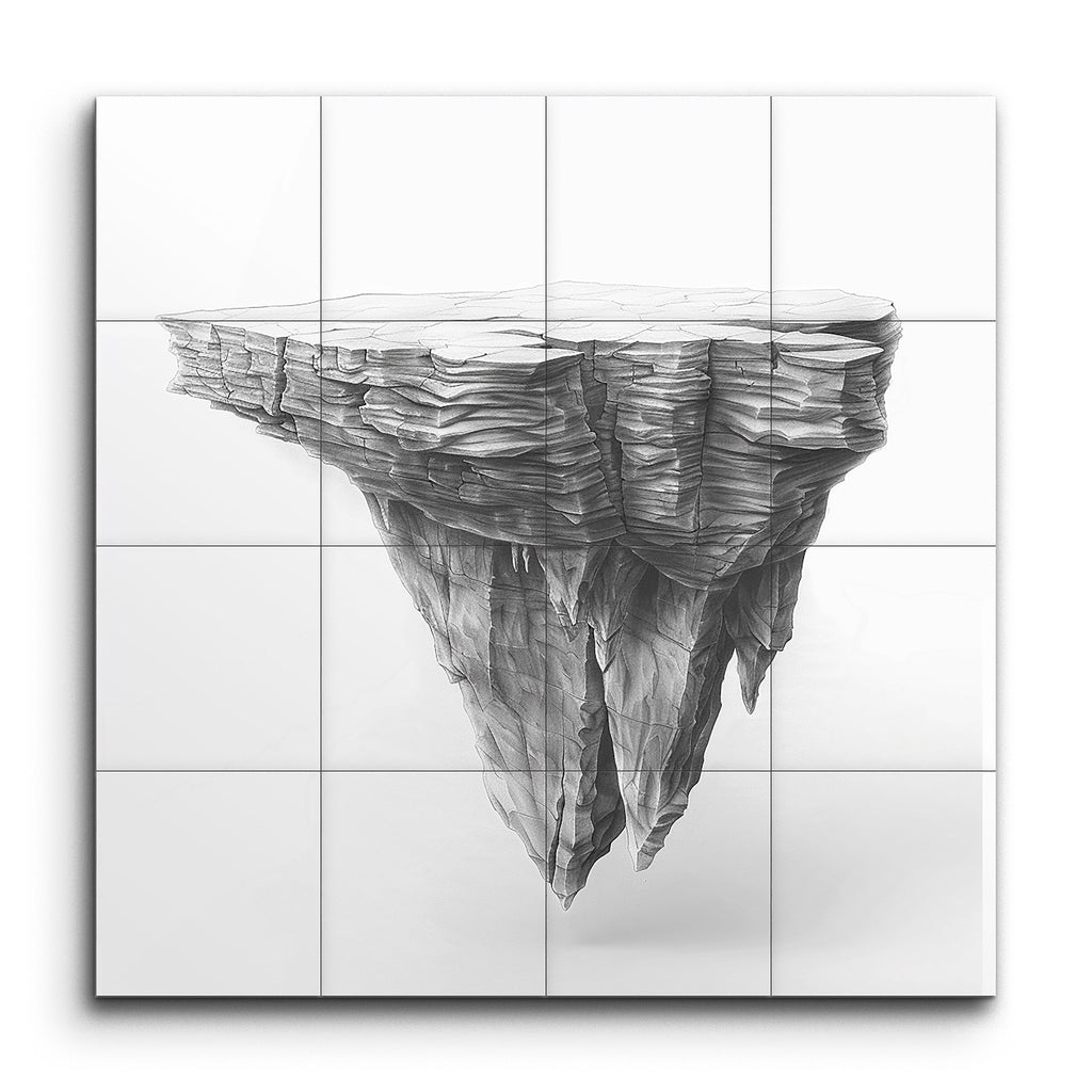 Plongez-vous dans la beauté surréaliste de cette fresque murale en carreaux monochromes en niveaux de gris, présentant une masse terrestre flottante qui défie la gravité. L'île triangulaire se rétrécit en un point aigu, ses bords rugueux et dentelés et ses strates rocheuses détaillées suggérant une riche histoire géologique. La surface supérieure plate et expansive contraste avec les couches complexes en dessous, mêlant réalisme et fantaisie. L'atmosphère saisissante et surnaturelle de cette œuvre d'art vous invite à explorer un royaume où la nature et l'imagination convergent.