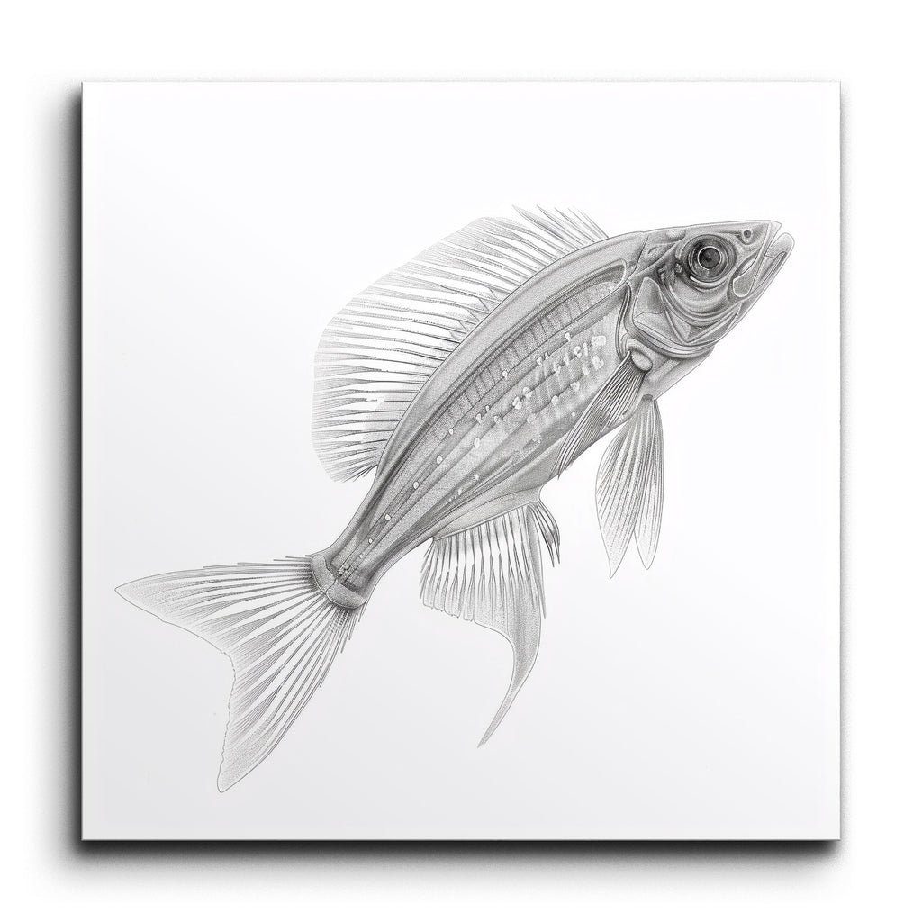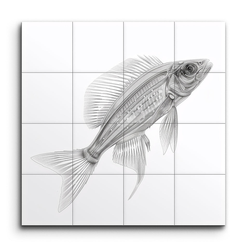 Transformez votre espace avec cette fascinante fresque en carreaux présentant une illustration méticuleusement détaillée d'un poisson dans une palette monochromatique en niveaux de gris. Cette œuvre d'art inspirée par la science met en valeur les caractéristiques anatomiques du poisson avec une clarté et une précision exceptionnelles. Des lignes délicates des nageoires aux dégradés subtils de l'ombre du corps, chaque élément est rendu à la perfection. L'œil réaliste et les écailles texturées ajoutent une touche de réalisme, rendant cette fresque à la fois informative et visuellement époustouflante.