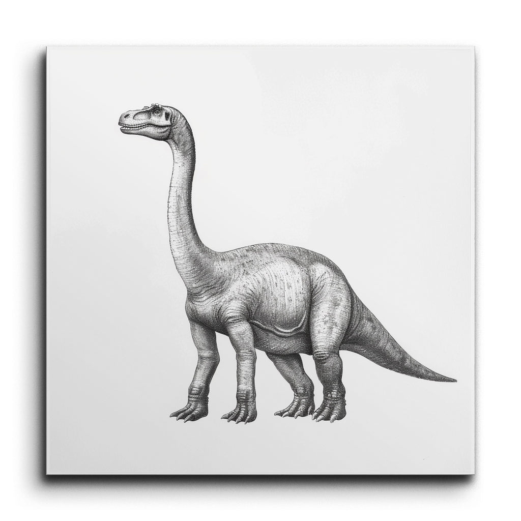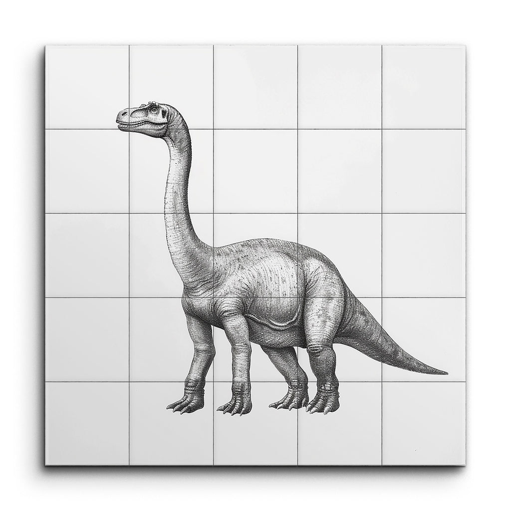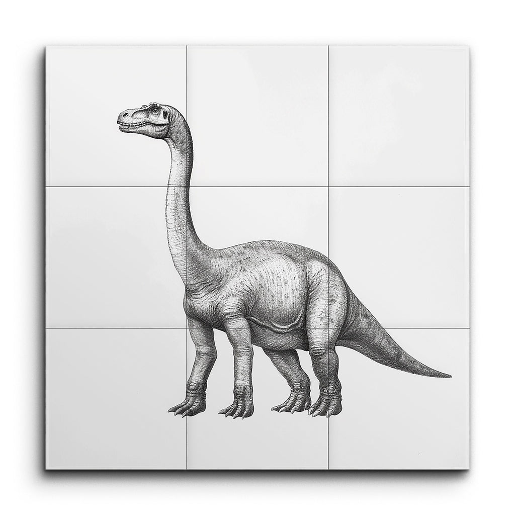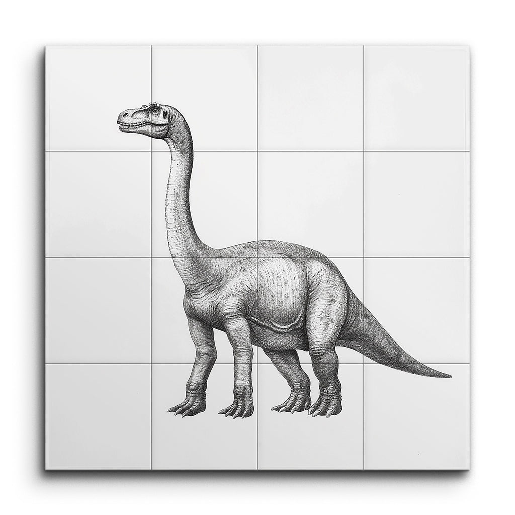 Transformez votre espace avec cette captivante fresque en carreaux mettant en vedette une illustration méticuleusement détaillée d'un majestueux dinosaure sauropode. Réalisée dans une palette monochromatique en noir et blanc, l'œuvre met en valeur le long cou, le corps massif et la texture de peau complexe du dinosaure avec une précision réaliste. Les lignes fines et les ombres apportent profondeur et texture, rappelant les illustrations scientifiques, mettant en avant le comportement calme et majestueux du dinosaure. Parfait pour ajouter une touche d'élégance préhistorique à tout environnement.
