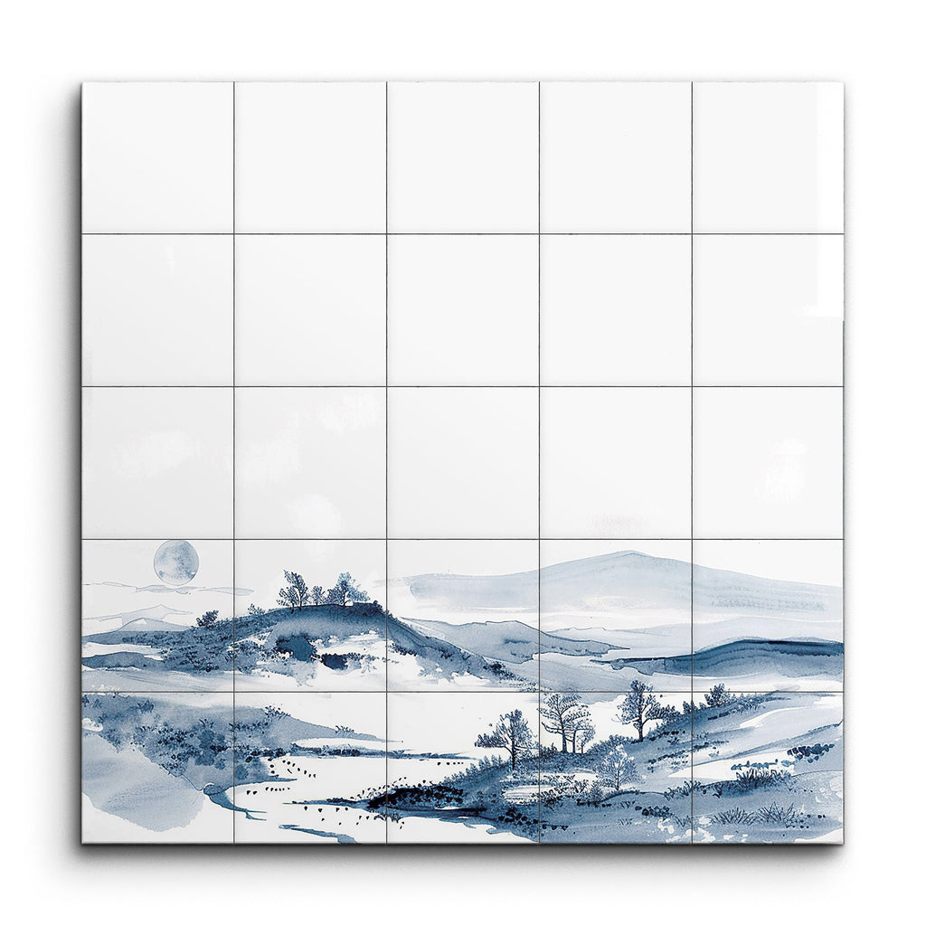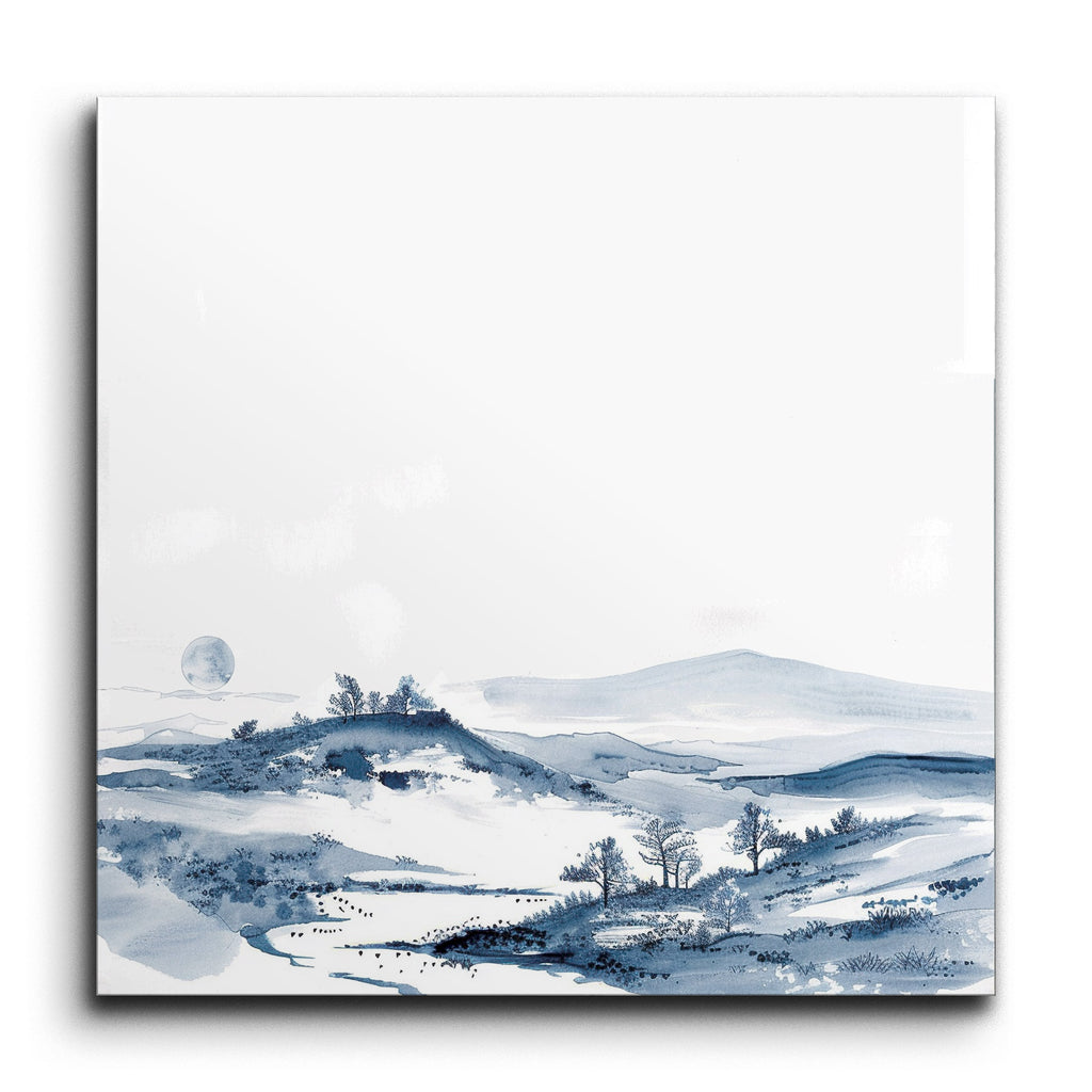 Transformez votre espace avec cette fresque murale sereine, présentant un paysage minimaliste dans une palette monochromatique de bleu. Un travail de pinceau délicat et des lignes fluides décrivent des collines doucement ondulées ornées d'arbres et d'arbustes épars, créant un sentiment de tranquillité et d'ouverture. Des nuances de bleu variées ajoutent de la profondeur et de la dimension, avec une lune éthérée et légère en arrière-plan qui renforce l'atmosphère calme et sereine. Inspirée par la peinture à l'encre traditionnelle de l'Asie de l'Est, cette fresque capture l'essence de la nature avec simplicité et élégance.