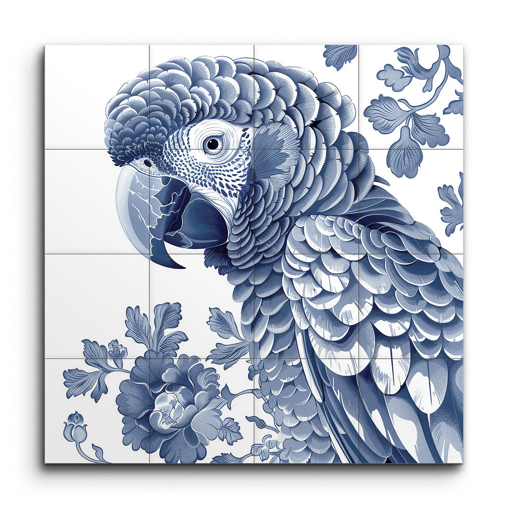 Transformez votre espace avec cette fascinante fresque en carreaux, mettant en valeur un perroquet méticuleusement détaillé dans une palette monochromatique de bleu. La représentation réaliste des plumes en couches complexes de l'oiseau et de son iris frappant attire le regard, tandis que les éléments floraux stylisés environnants ajoutent une touche de charme ornemental. Évoquant les designs traditionnels bleu et blanc Porcelaine, cette œuvre d'art combine réalisme et motifs décoratifs dans une composition harmonieuse et élégante, parfaite pour rehausser tout intérieur avec sa beauté saisissante.