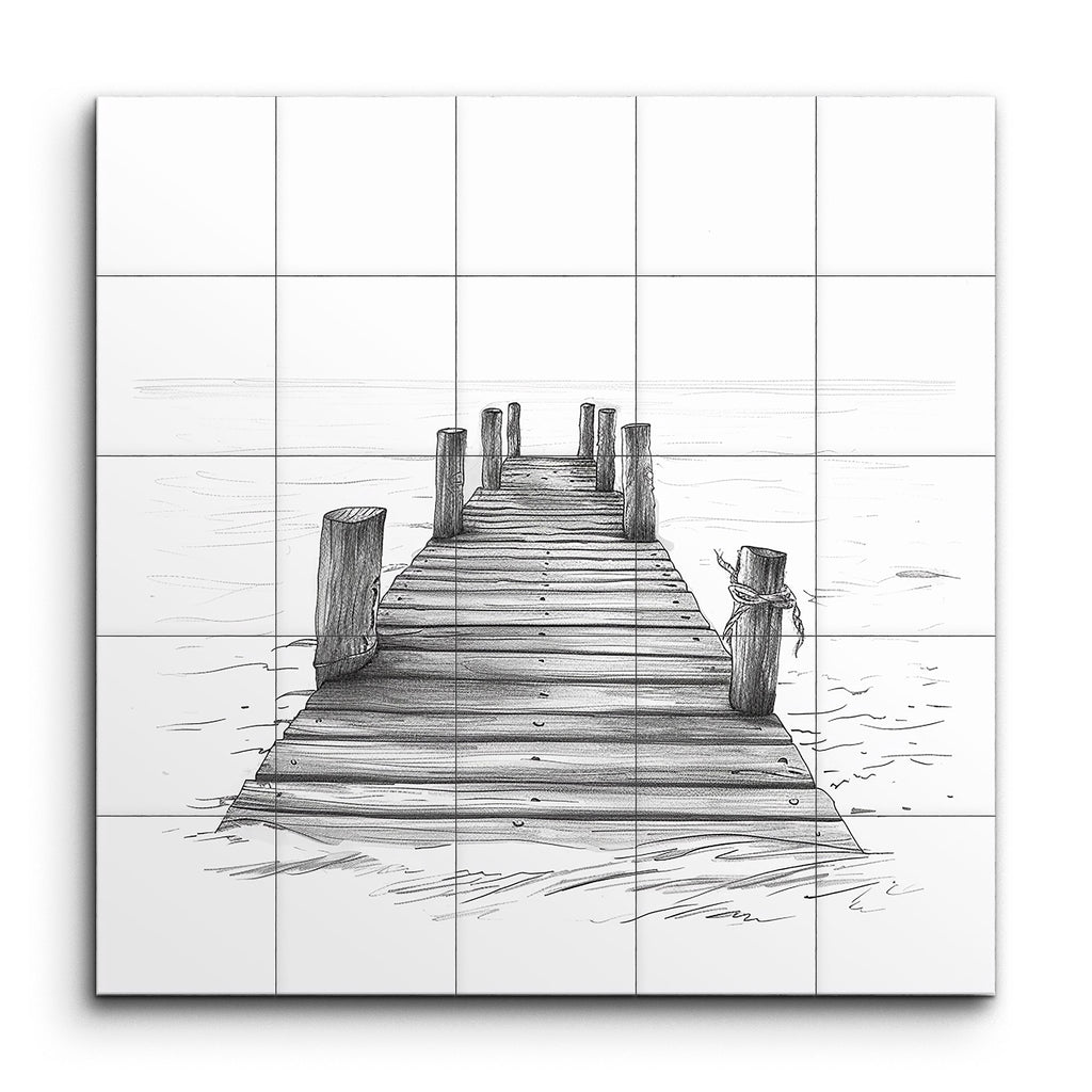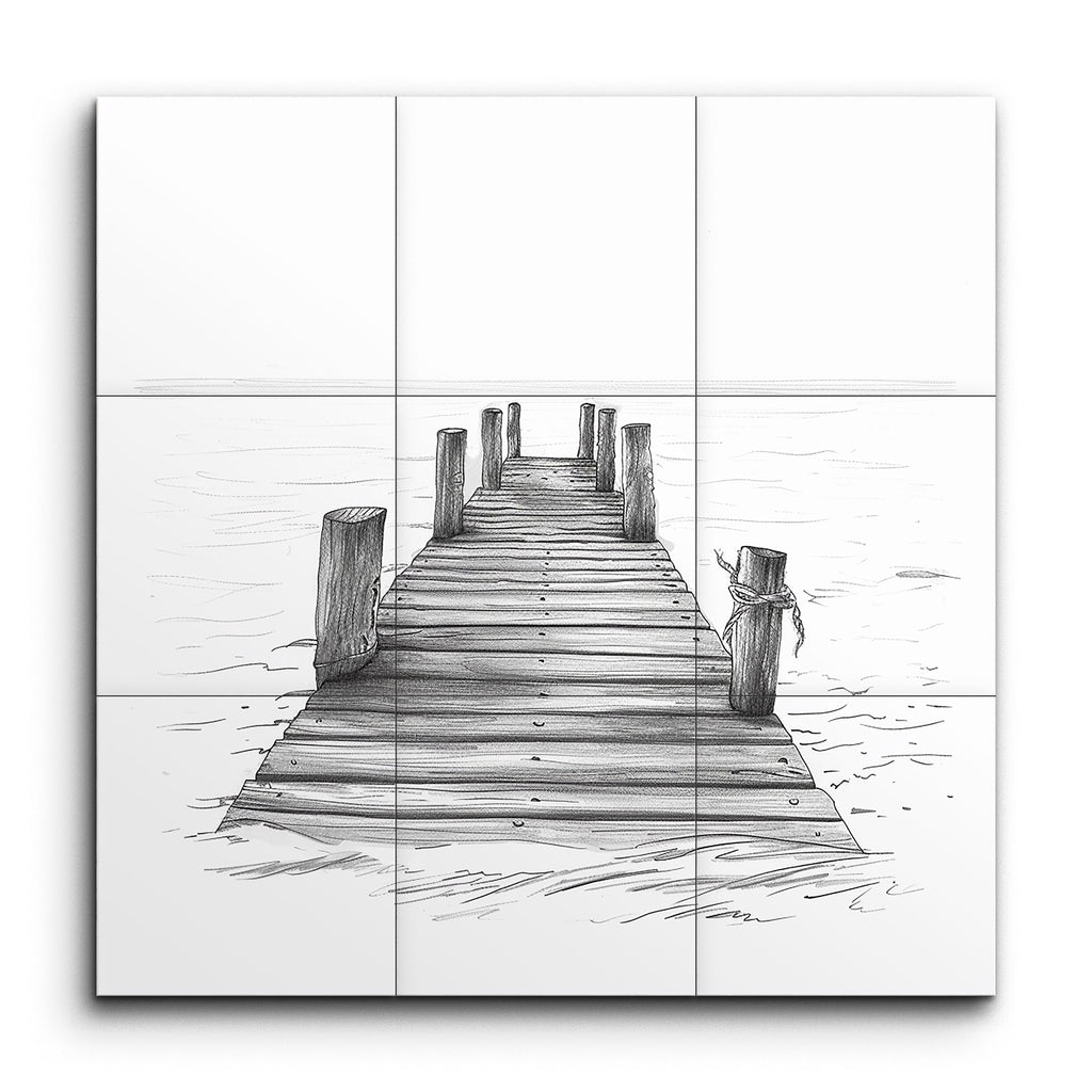 Transformez votre espace avec cette magnifique fresque en carrelage représentant un quai en bois serein s'étendant dans des eaux tranquilles. Les planches rustiques et vieillies et les boulons méticuleusement illustrés dégagent du réalisme, tandis que les poteaux légèrement inclinés et la corde lâchement attachée ajoutent une touche nautique charmante. Le style minimaliste et monochromatique dans des nuances de noir et de gris, associé à un ombrage précis et à un travail de ligne délicat, crée un sentiment de profondeur et de tranquillité intemporelle. Parfait pour évoquer le calme et la sérénité dans n'importe quel environnement.