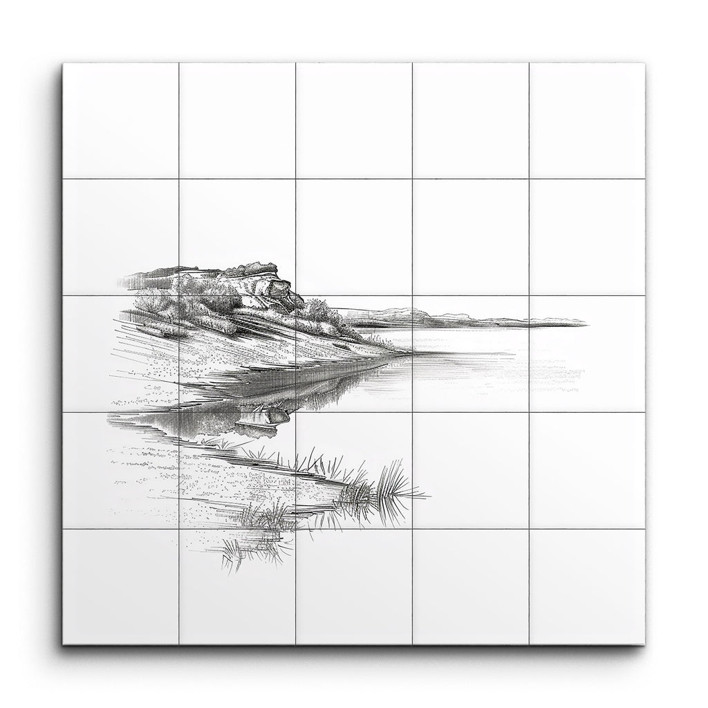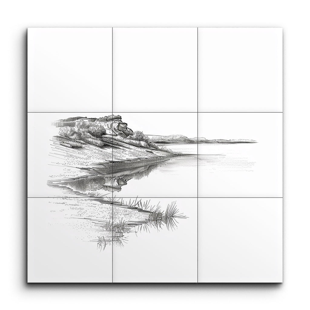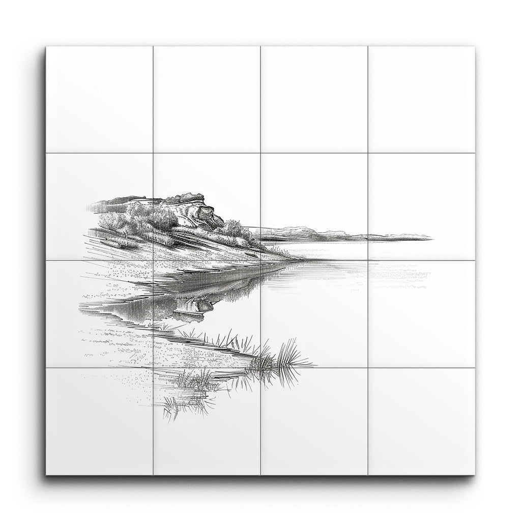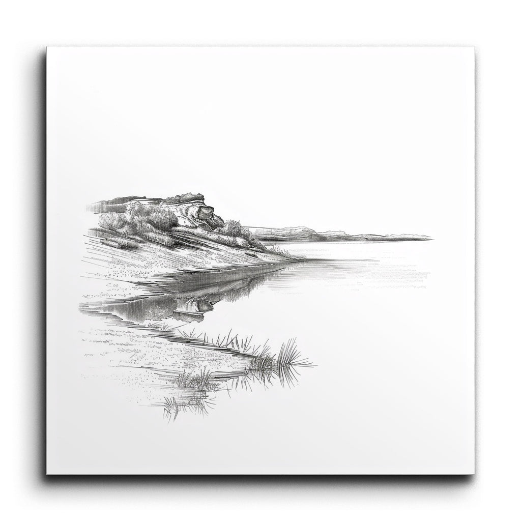 Plongez-vous dans la beauté tranquille de la nature avec cette fresque murale minimaliste en noir et blanc. La scène sereine au bord du lac capture un corps d'eau calme, reflétant le paysage environnant avec des lignes horizontales délicates. À gauche, un affleurement rocheux orné d'herbes et de petits buissons s'étend dans l'eau, tandis que l'horizon flou à droite évoque un sentiment d'immensité et de paix. Les lignes nettes et précises ainsi que l'ombrage subtil apportent profondeur et élégance à ce chef-d'œuvre naturel paisible.