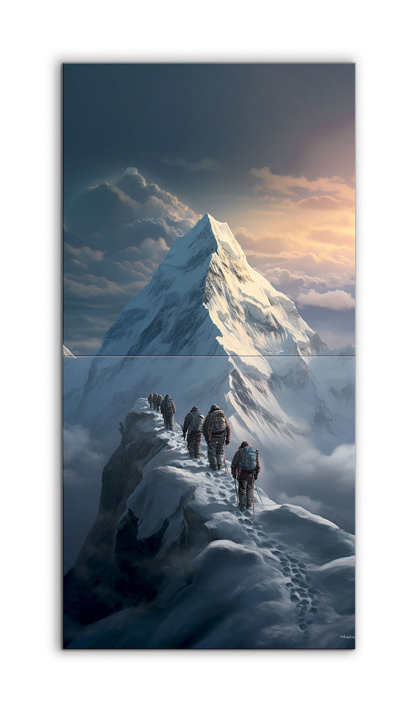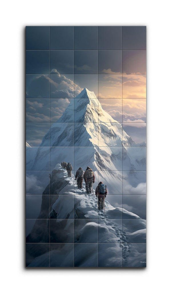 Cette fresque en carreaux représente une scène montagneuse à couper le souffle avec un sommet majestueux, couvert de neige, illuminé par une lumière dorée et chaleureuse. Le contraste dramatique entre la neige baignée de soleil et les zones ombragées accentue la grandeur du paysage. Au premier plan, des grimpeurs en équipement d'hiver lourd naviguent sur une étroite crête recouverte de neige, leurs empreintes créant un chemin vers le sommet majestueux. Le style très réaliste et les détails méticuleux capturent la sérénité et le défi redoutable de l'alpinisme en haute altitude.