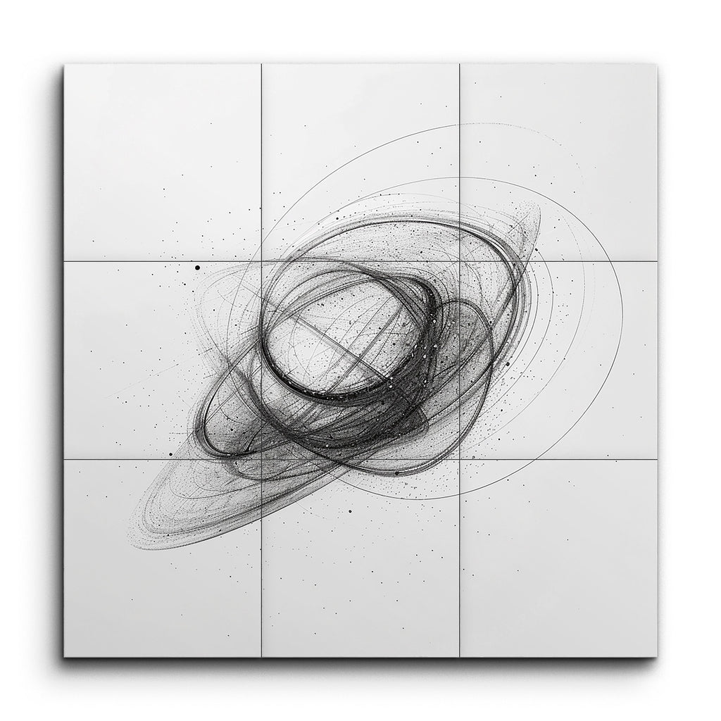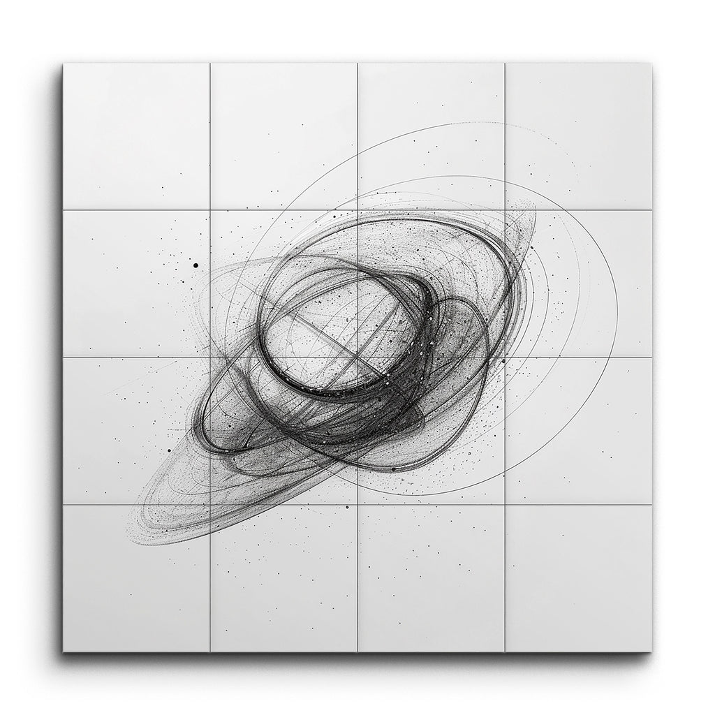 Transformez votre espace avec cette fresque de carreaux fascinante présentant un design abstrait et complexe de fines lignes noires. Le motif tourbillonnant, rappelant une forme elliptique ou orbitale, crée un sens dynamique de profondeur et de mouvement. La zone centrale densément remplie se disperse progressivement en lignes plus légères, évoquant un mouvement céleste. Des points et des éclats éparpillés améliorent la texture, tandis que le style minimaliste et monochromatique met en valeur l'interaction fluide de la lumière et de l'ombre. Parfait pour ajouter une touche d'élégance et d'intrigue à n'importe quelle pièce.