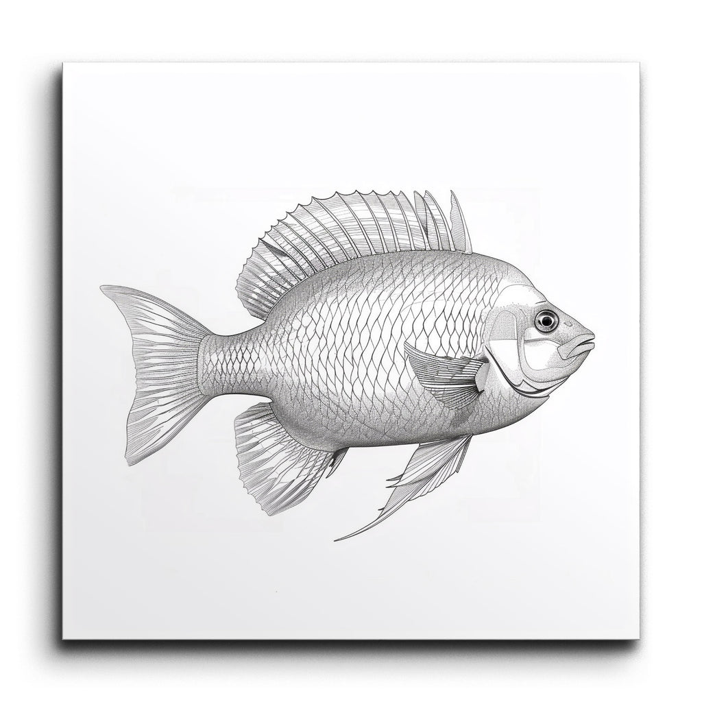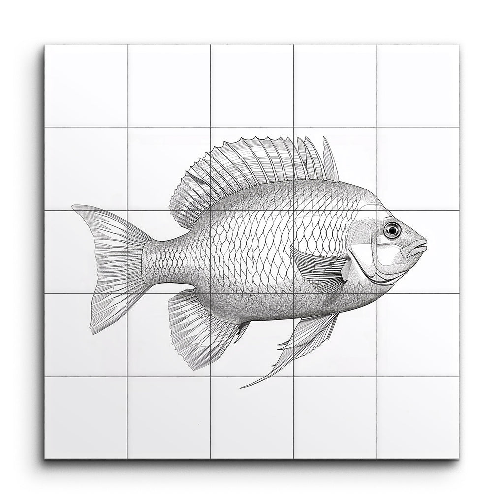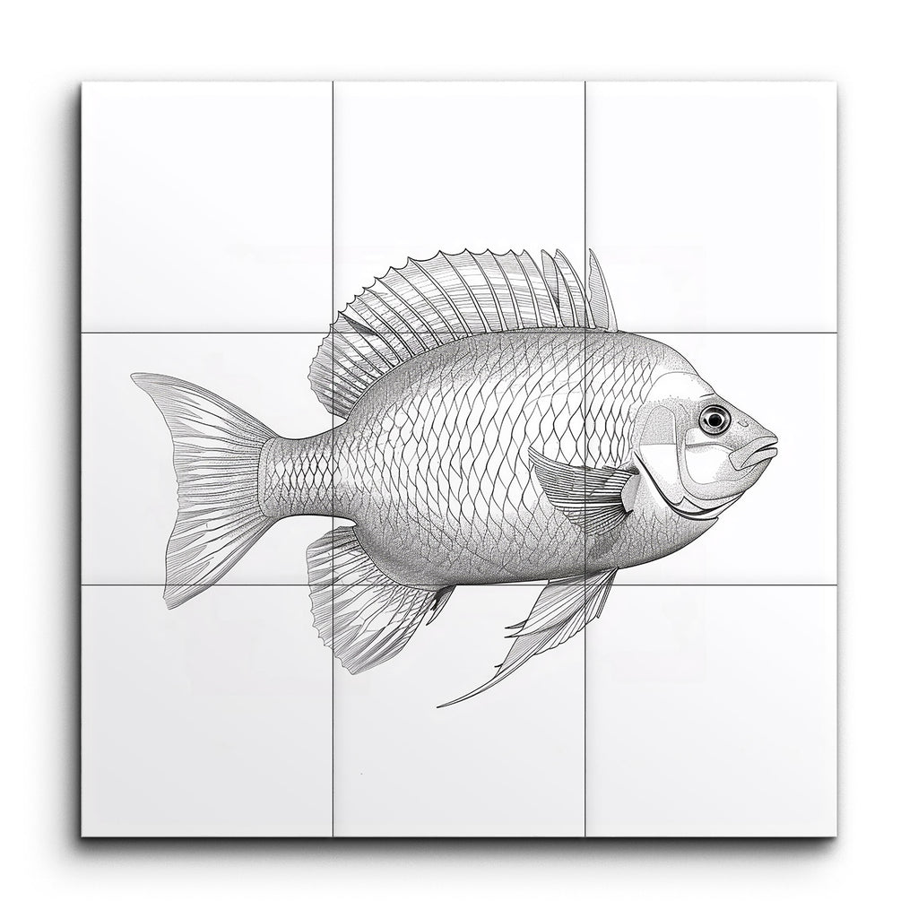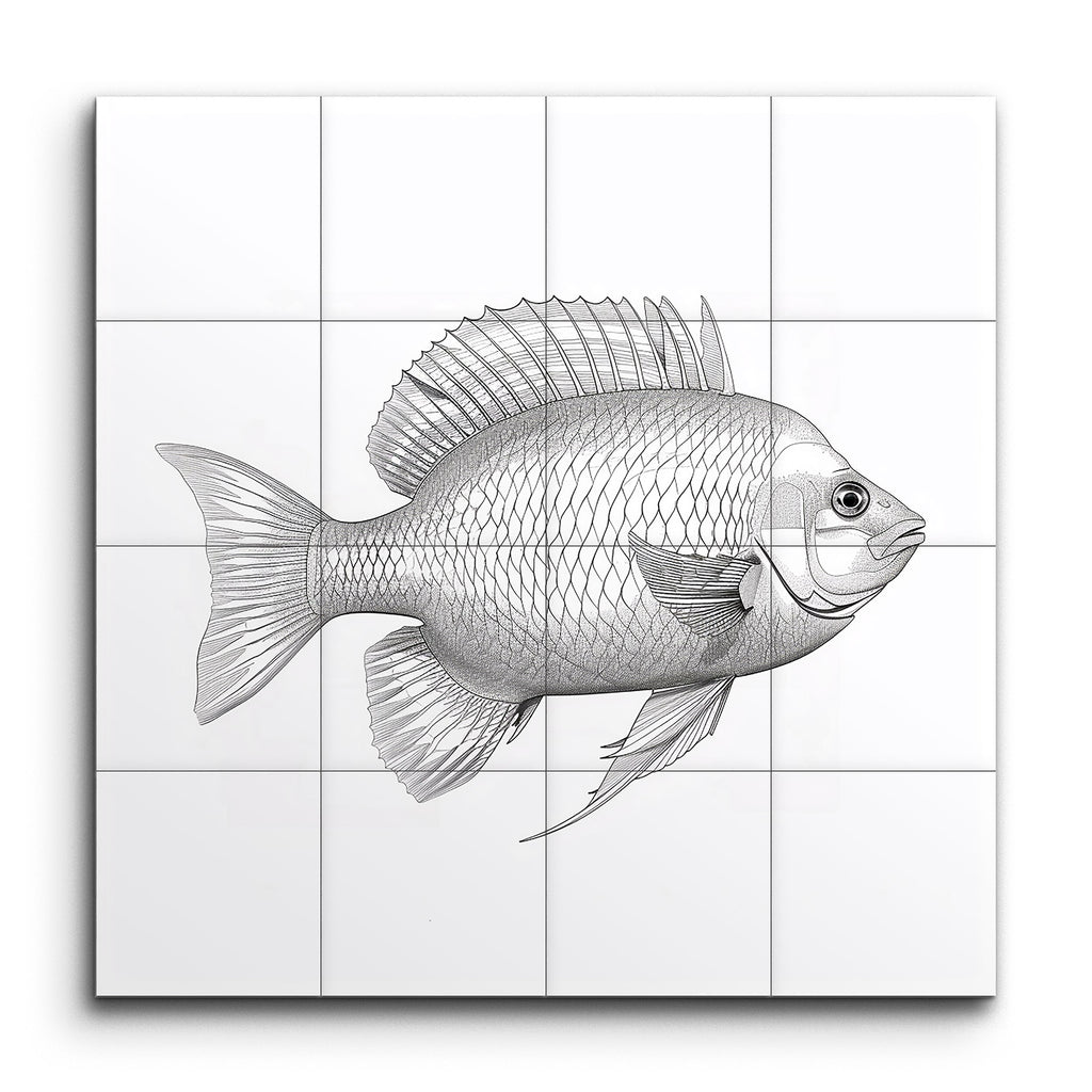 Plongez-vous dans la beauté complexe de la vie marine avec cette magnifique fresque en carreaux. Cette illustration en noir et blanc capture un poisson dans des détails exquis, de ses écailles méticuleusement rendues à sa nageoire dorsale proéminente et finement dessinée. La vue de profil met en valeur l'ensemble de la forme du poisson, avec des lignes fines et des ombrages qui donnent vie à la profondeur et à la texture. Le style d'illustration scientifique met l'accent sur la précision, faisant de cette œuvre d'art un point focal captivant pour tout espace.