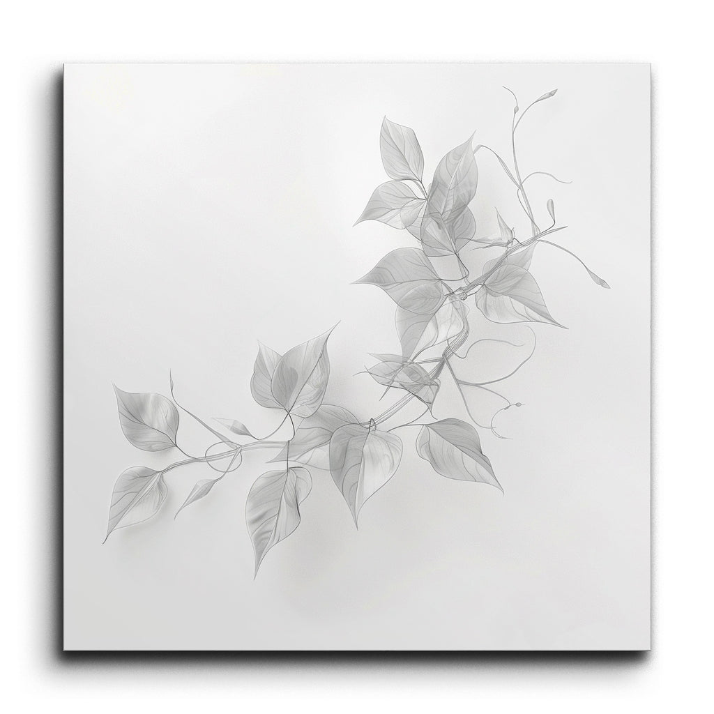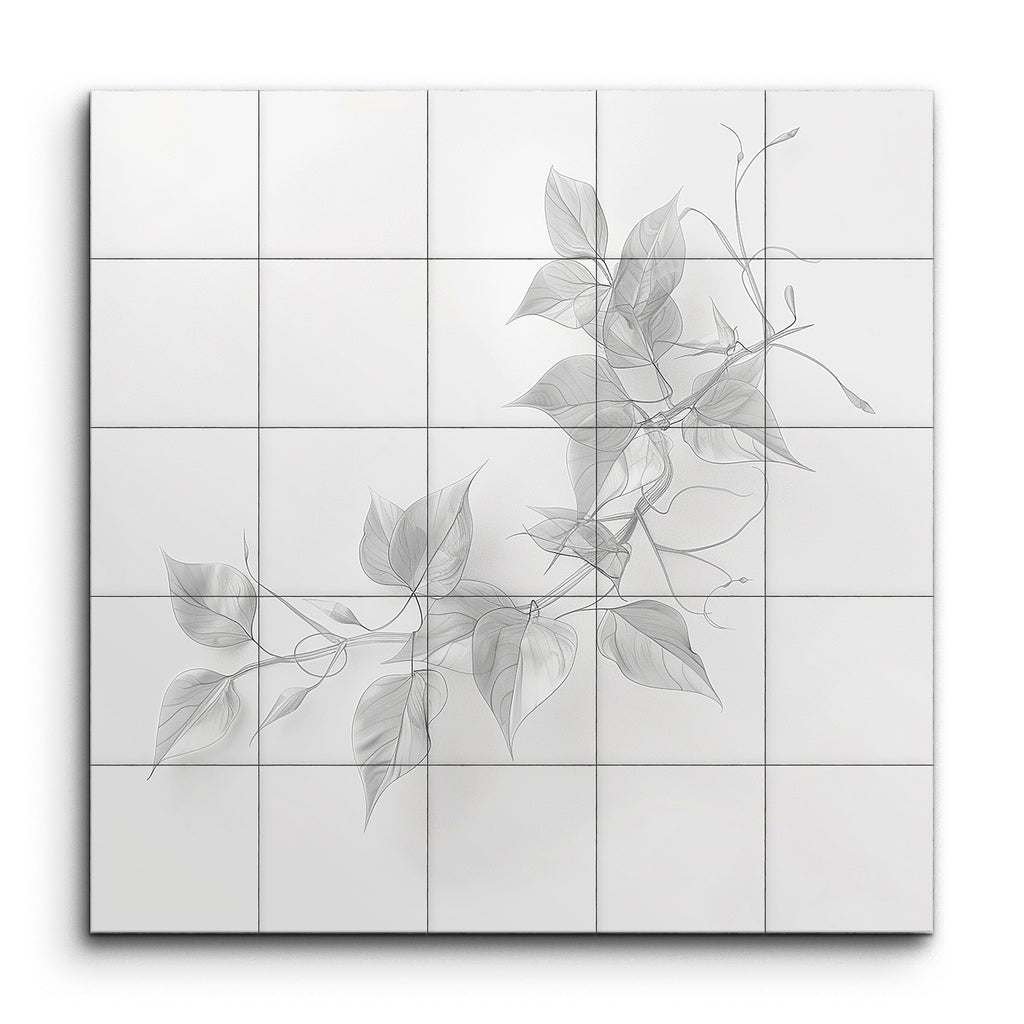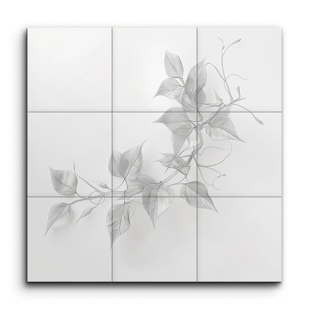 Transformez votre espace avec notre magnifique fresque en carreaux, mettant en vedette une délicate vigne avec des feuilles finement détaillées. Chaque feuille présente des veines réalistes et des variations d'ombre subtiles, capturant l'élégance de la nature. La vigne qui s'enroule gracieusement, avec ses vrilles et ses tiges entrelacées, crée une composition organique et fluide. Rendu en niveaux de gris, cette œuvre d'art minimaliste dégage une qualité douce et éthérée, mettant en valeur la beauté des formes naturelles dans leur essence la plus pure.