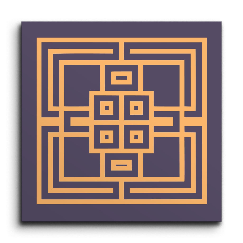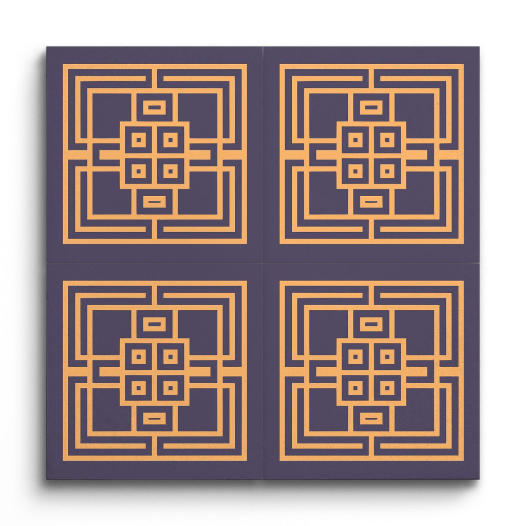 Ce carreau décoratif présente un design géométrique classique de l'Art Déco, caractérisé par une disposition harmonieuse de carrés et de rectangles. Les lignes audacieuses et précises créent un élégant sens de l'ordre, avec un fond violet profond magnifiquement contrasté par des détails dorés. La combinaison de couleurs dégage luxe et sophistication, capturant parfaitement l'opulence et le glamour de l'époque Art Déco. Ce design épuré et moderne fait une déclaration frappante dans n'importe quel cadre.