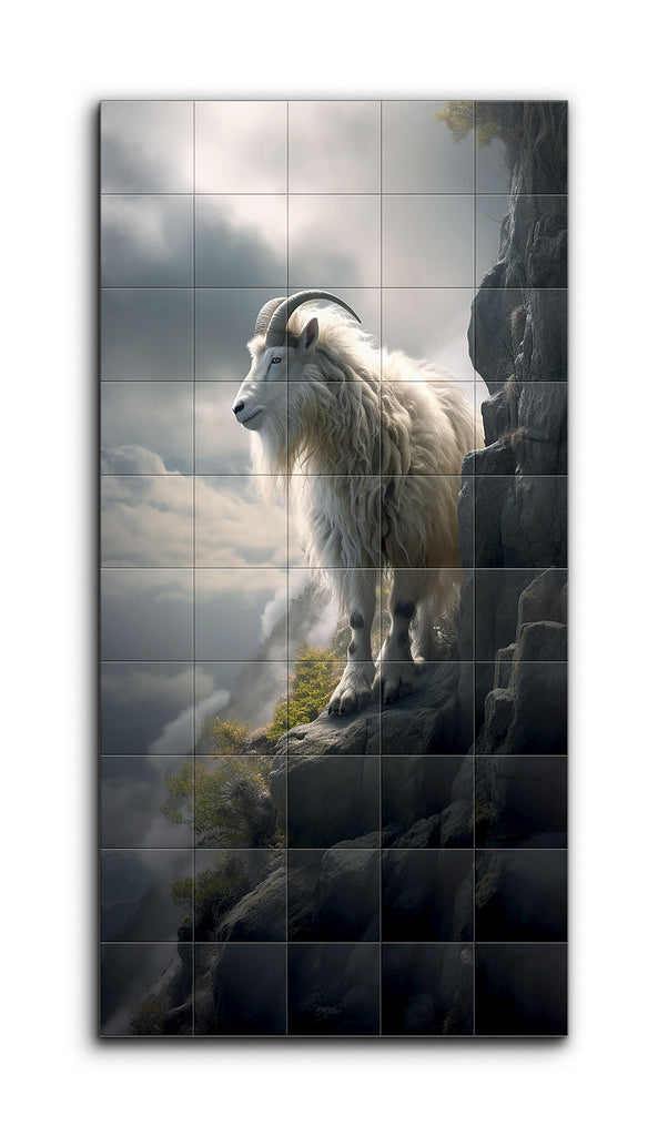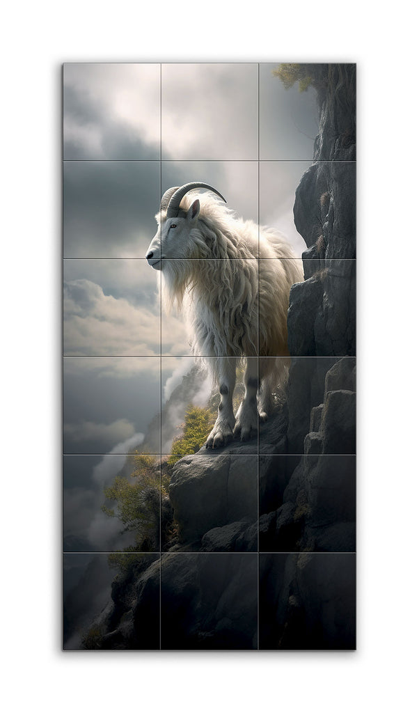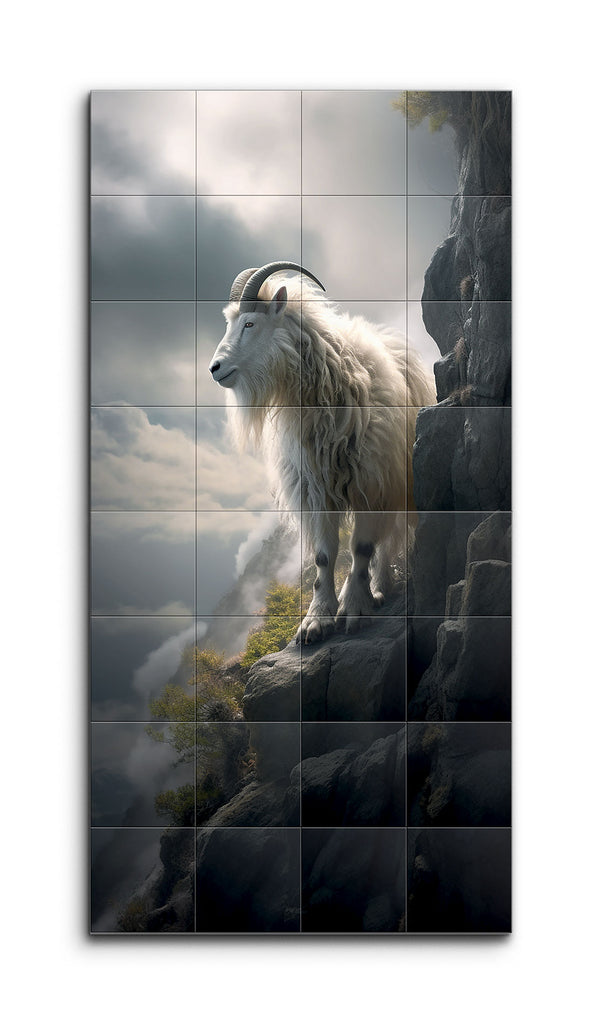 Cette fresque en carreaux représente un majestueux bouquetin se tenant avec confiance sur un ledge rocheux. Les longues cornes courbées du bouquetin et son épaisse fourrure blanche légèrement ébouriffée sont minutieusement détaillées, capturant son attitude vigilante et forte. L'arrière-plan présente un ciel dramatique et nuageux avec des touches de lumière du soleil, ajoutant de la profondeur et de l'atmosphère. Le terrain accidenté est représenté de manière complexe avec des bords nets et des ombres, tandis que des taches de verdure suggèrent un cadre en haute altitude. L'œuvre est hautement réaliste, avec une ambiance sereine mais puissante.