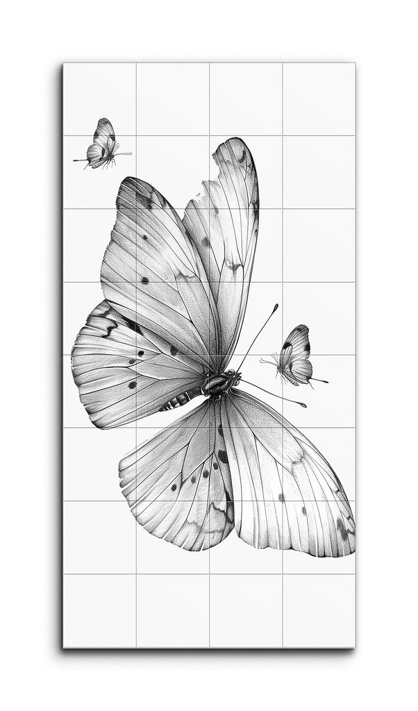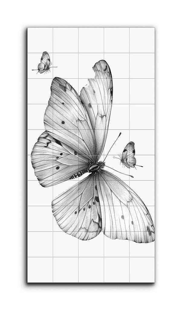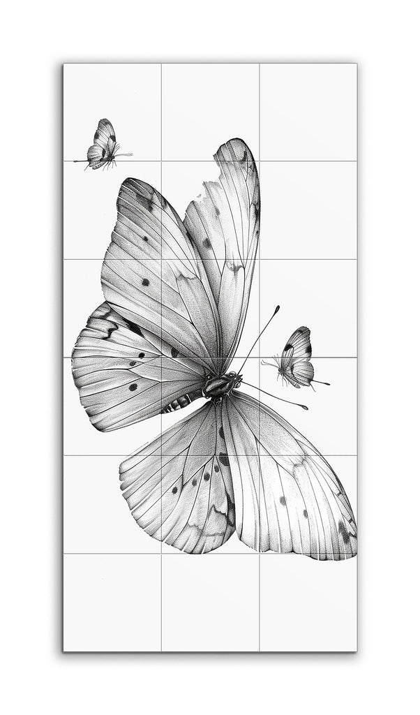 Cette fresque en carreaux présente une illustration très réaliste de trois papillons. Le papillon central, avec ses grandes ailes finement détaillées, domine la scène. Ses ailes présentent un délicat dégradé d'ombre, mettant en valeur la texture et les motifs naturels. Deux papillons plus petits, rendus avec une précision similaire, sont positionnés à proximité, ajoutant de la profondeur et du mouvement. Les tons monochromatiques soulignent les lignes fines et l'ombrage détaillé, créant une composition intemporelle et élégante qui célèbre la beauté de ces délicates créatures.