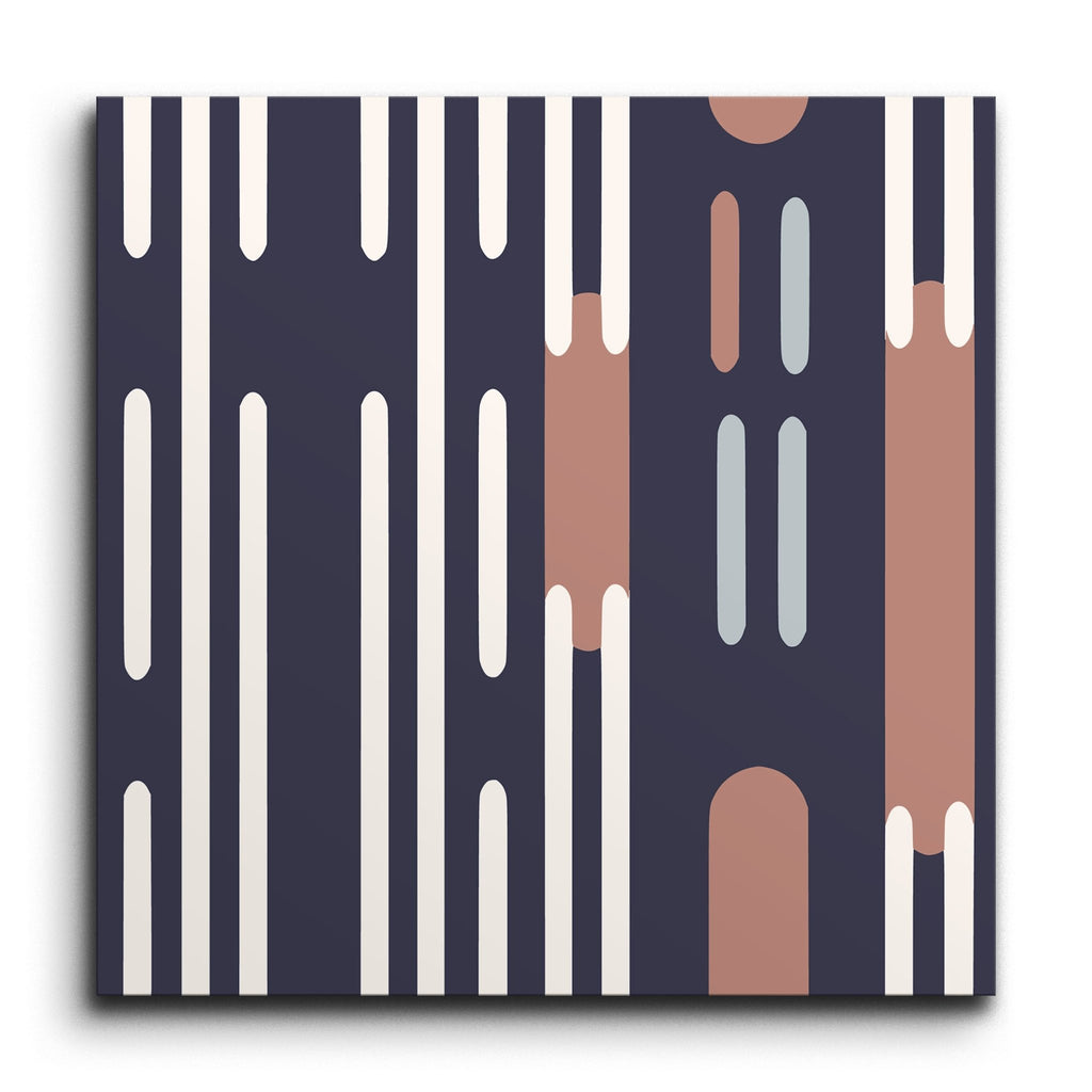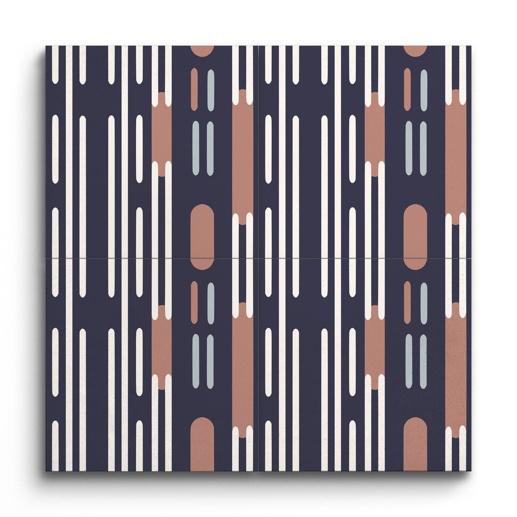 Ce carreau de décoration présente un motif géométrique captivant composé de formes et de lignes verticales allongées, offrant un attrait visuel rythmique et structuré. La palette de couleurs harmonieuse mélange un bleu marine profond avec un beige doux, un rose pâle et un gris clair, résultant en une esthétique contemporaine et équilibrée. Le minimalisme du design est complété par son accent saisissant sur la symétrie, en faisant un ajout élégant à tout espace.