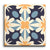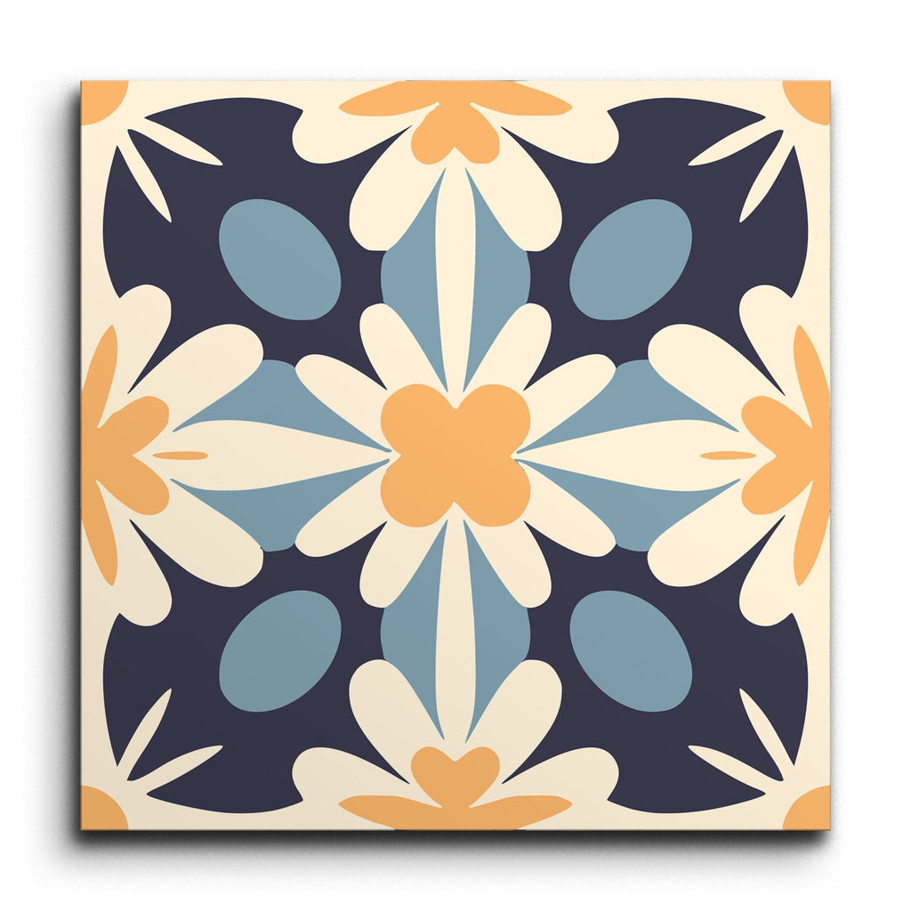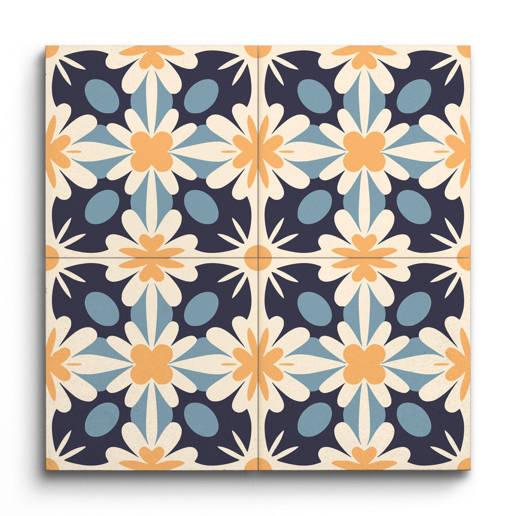 This decor tile showcases a charming encaustic pattern with a vintage touch. At its heart is a symmetrical floral motif, where delicate petal shapes emerge from a central flower. The palette combines soft, muted tones of navy blue, light blue, cream, and a warm orange, weaving together a harmonious and balanced design. Bold outlines and contrasting hues enrich the visual depth, capturing the timeless appeal of classic encaustic tiles.