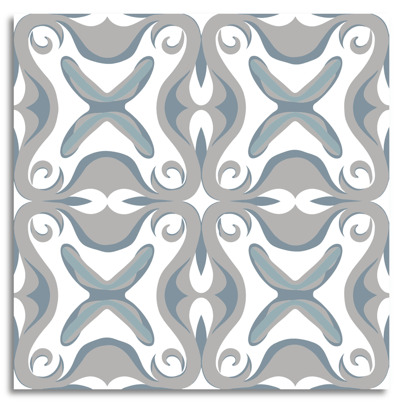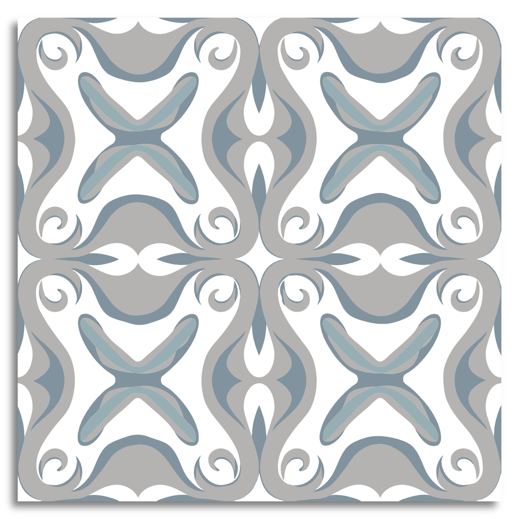 This decor tile showcases a symmetrical design adorned with intricate, swirling motifs that evoke a sense of movement and fluidity. Dominated by shades of gray and off-white, the tile exudes a balanced and harmonious aesthetic. Its repeating elements form a seamless and cohesive pattern, characteristic of classic encaustic tiles. Blending traditional craftsmanship with a contemporary flair, this tile is a versatile choice for various interior decor styles.