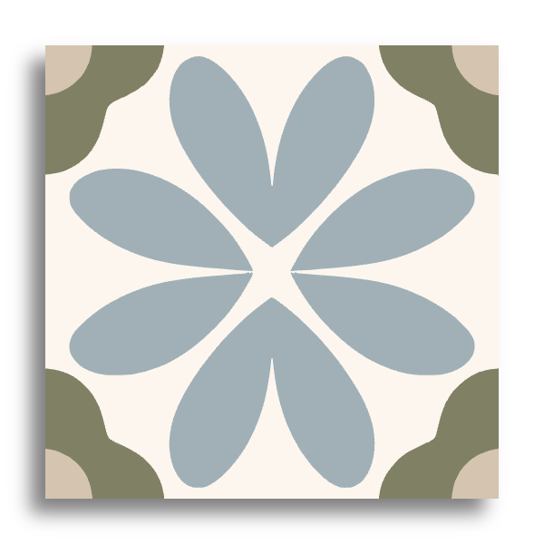 This decor tile showcases a captivating encaustic-inspired pattern, featuring a floral motif with petal-like shapes in a warm terracotta hue. These elements are beautifully contrasted against a cream background, offering a striking visual appeal. The corners are enhanced with soft blue and dark navy scalloped forms, introducing a delicate geometric touch. The earthy, muted color palette lends a timeless and classic aesthetic, perfect for adding a touch of artistic elegance to any space.