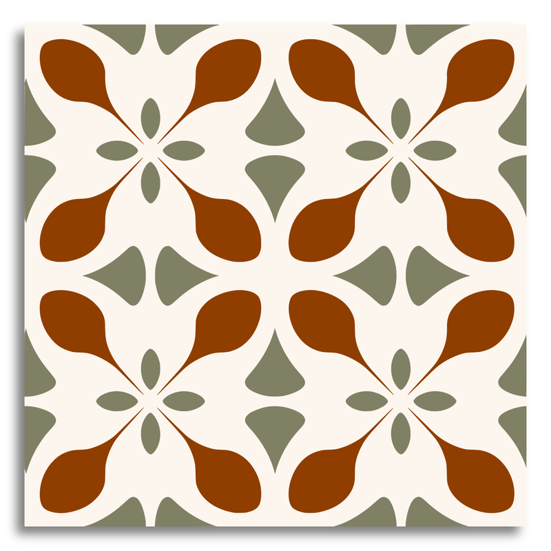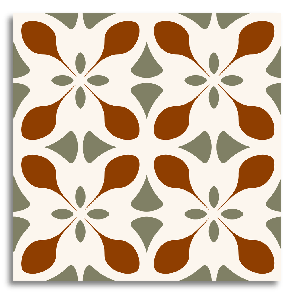 This decor tile showcases a classic encaustic pattern, blending floral and geometric motifs with teardrop shapes and petal-like forms. The muted blue and terracotta hues set against a soft white background create a harmonious balance, offering a timeless yet modern aesthetic. Its intricate design is versatile, seamlessly complementing a variety of interior styles.