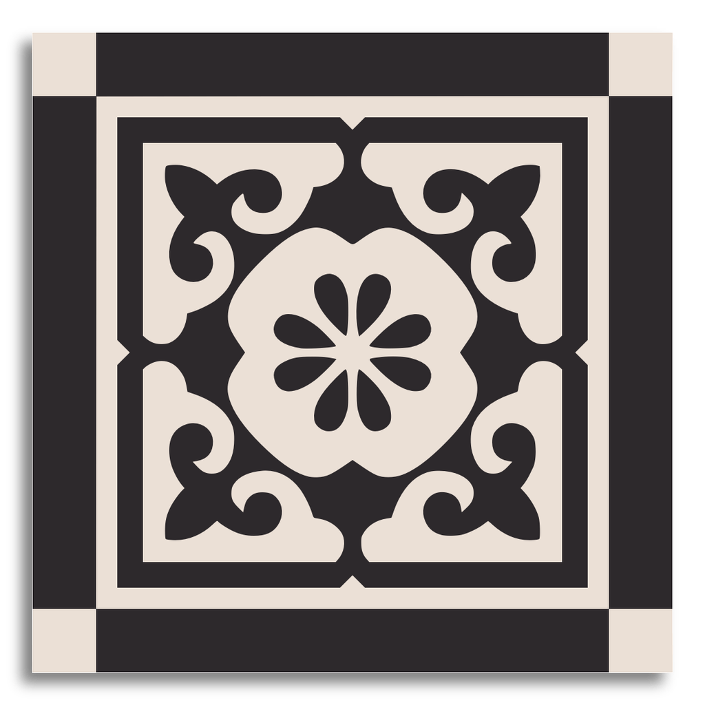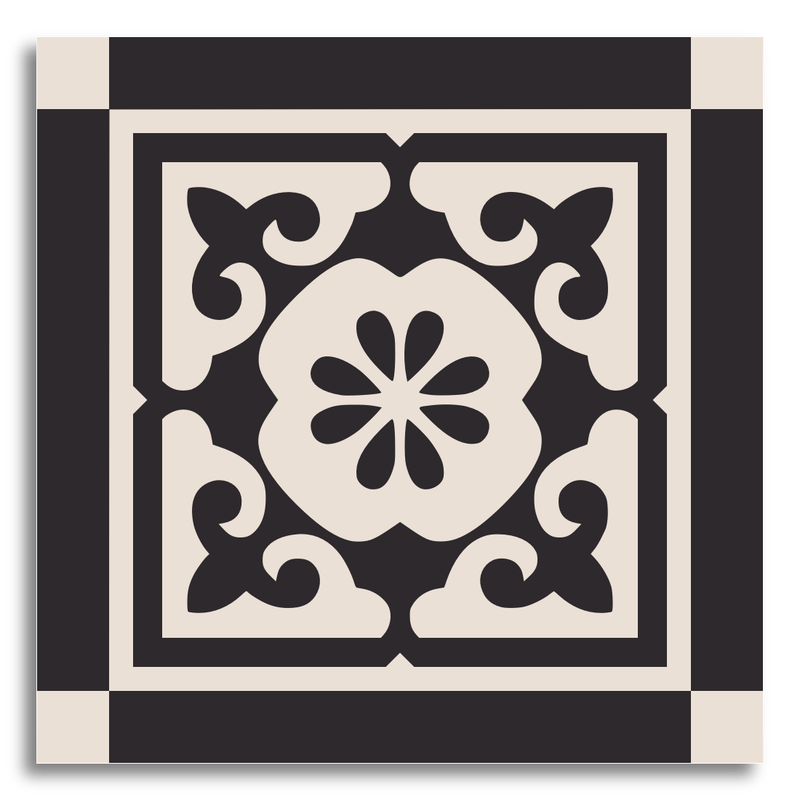 This decor tile presents a classic encaustic pattern that exudes elegance through its symmetrical and ornate design. A central floral motif, crafted in a soft blue-gray, is the focal point, surrounded by delicate scrollwork and geometric lines. The corners feature small squares in the same soothing hue, creating a harmonious balance. Set against a light, neutral background, the intricate details of the pattern are beautifully highlighted. Its subtle color palette and timeless style make it a sophisticated choice for any space.