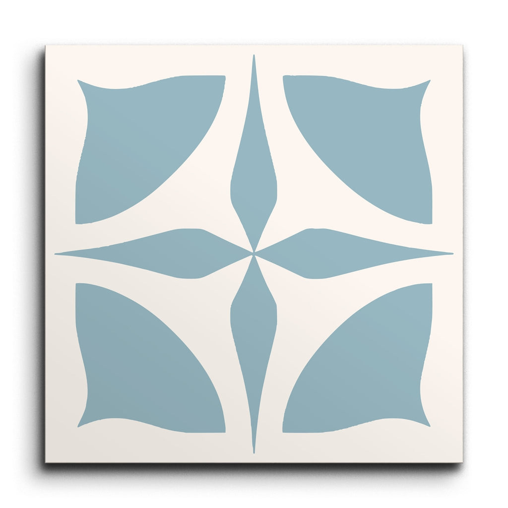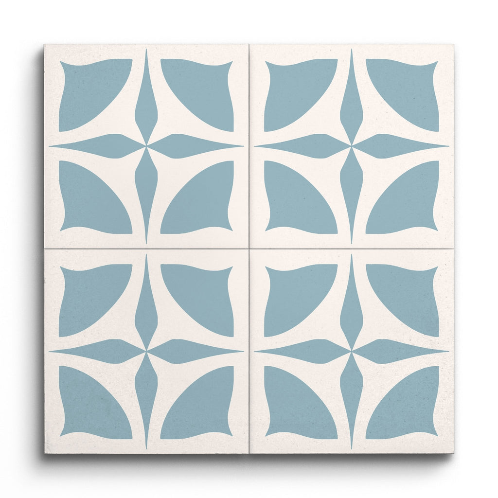 Ce carreau de décoration présente un style classique d'encaustique avec un motif symétrique de quatre formes semblables à des pétales rayonnant à partir d'un point central. Les tons bleu doux contrastent magnifiquement avec le fond crème, offrant une esthétique apaisante et intemporelle. Sa symétrie géométrique élégante en fait un choix polyvalent pour tout espace, alliant charme traditionnel et sophistication discrète.