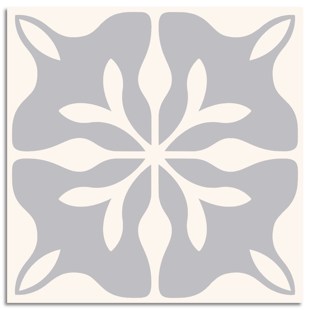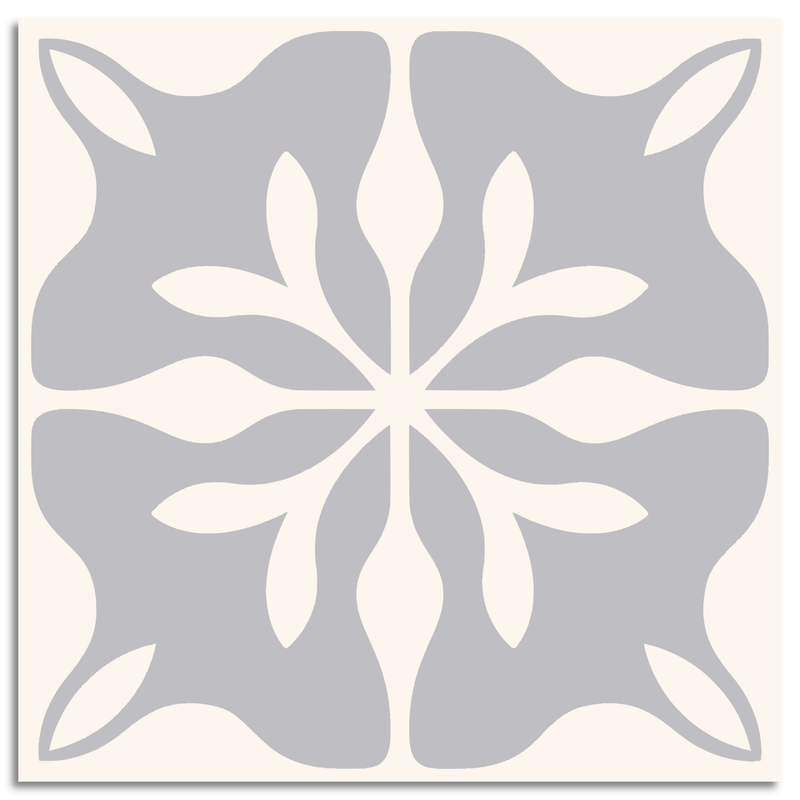 This decor tile showcases an enchanting encaustic pattern, with a harmonious blend of symmetry and intricacy. At its heart, a floral motif unfolds, its stylized petal shapes delicately radiating outward. The soft gray background provides a serene canvas, beautifully offset by off-white elements that enhance the design's elegance. This tile captures the essence of classic tradition, offering a timeless aesthetic that complements a variety of interiors.