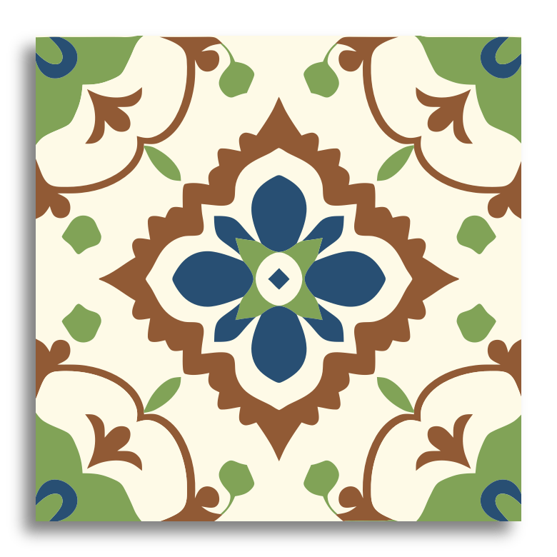 This decor tile showcases the timeless elegance of encaustic style with its beautifully symmetrical design. At its heart, a floral-like motif flourishes, featuring petal elements in striking black and mustard yellow hues that draw the eye. Encircling this centerpiece is a scalloped border in rich maroon, adding depth and sophistication. The creamy white background enhances the intricate patterns, ensuring each detail stands out vividly. The earthy tones of maroon, black, mustard yellow, and cream come together to create a warm, inviting ambiance. The mix of curved and geometric shapes results in a balanced and harmonious aesthetic, making this tile a captivating addition to any space.