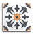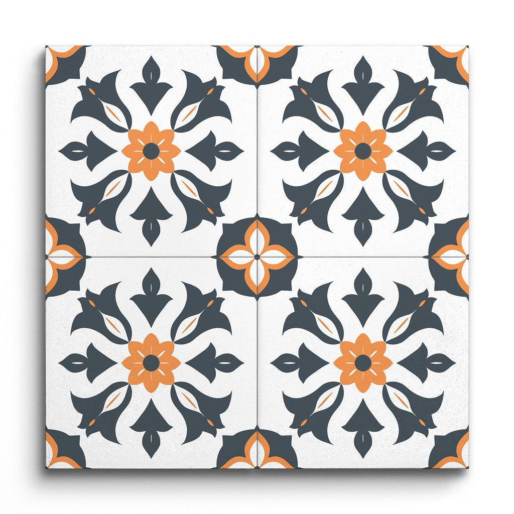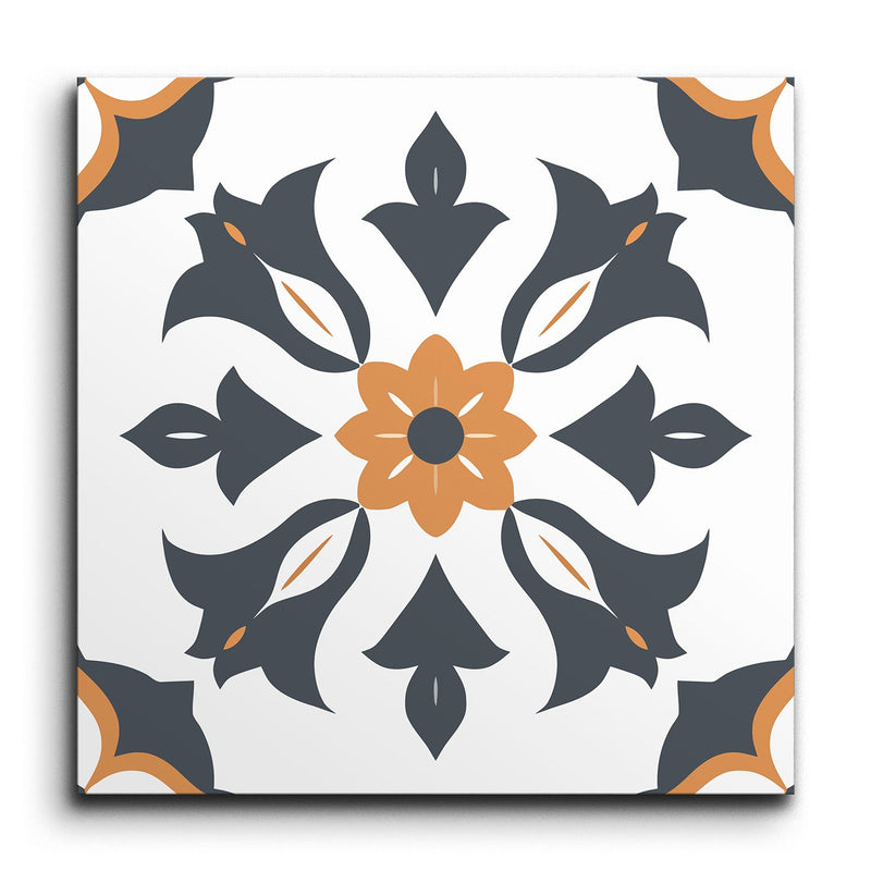 This decor tile showcases a beautifully symmetrical design centered around a floral motif in a rich, earthy orange. Encircling the central flower are abstract, leaf-like shapes rendered in a deep gray, creating a striking contrast. The backdrop is a pristine white, which accentuates the intricate detailing of the pattern. The overall aesthetic draws inspiration from traditional encaustic tiles, commonly seen in Mediterranean and Spanish decor. This design radiates vintage charm paired with timeless elegance, seamlessly fitting into both classic and modern interiors.