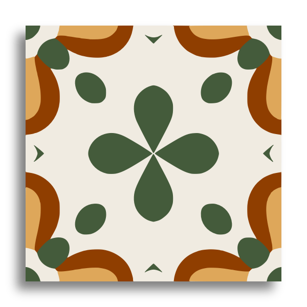 This decor tile showcases a contemporary style with a symmetrical design that draws the eye to its central floral motif. Teardrop shapes in a muted blue form the heart of the design, while surrounding wave-like elements in terracotta and beige add depth and movement. The color palette is soft and earthy, creating a warm and inviting atmosphere that complements modern interiors.