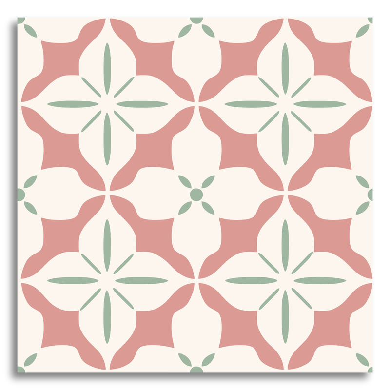 This decor tile presents a classic encaustic style with a symmetrical, floral-inspired pattern. Soft pink and white hues intertwine with subtle gray accents, emphasizing its geometric elements. The muted color palette lends a timeless appeal, while the floral motifs introduce an elegant and charming touch. The structured, repetitive design ensures a harmonious and balanced aesthetic, making it a versatile choice for any space.