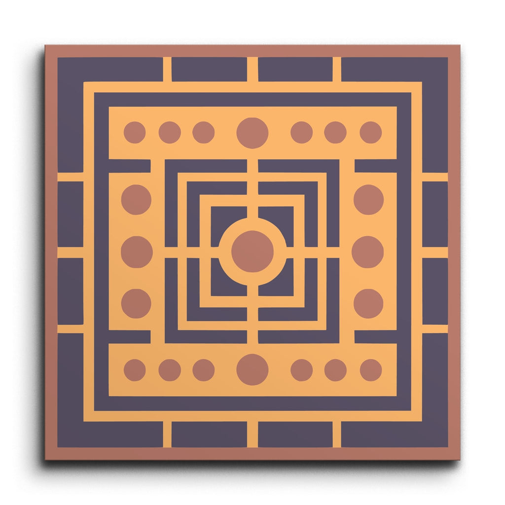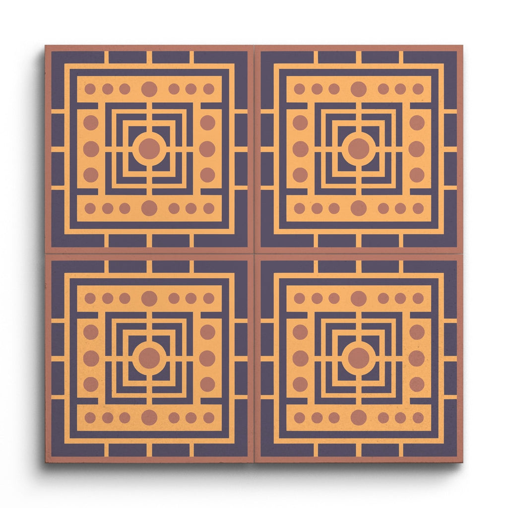 Ce carreau décoratif présente un design géométrique captivant, avec des carrés et des cercles concentriques qui apportent un mélange harmonieux de symétrie et d'équilibre à tout espace. Les teintes chaudes de brun et d'orange atténué créent une atmosphère accueillante et terreuse. Les formes et lignes répétitives mettent en valeur l'élégance structurée typique des styles géométriques, ajoutant une touche de sophistication à votre décor.