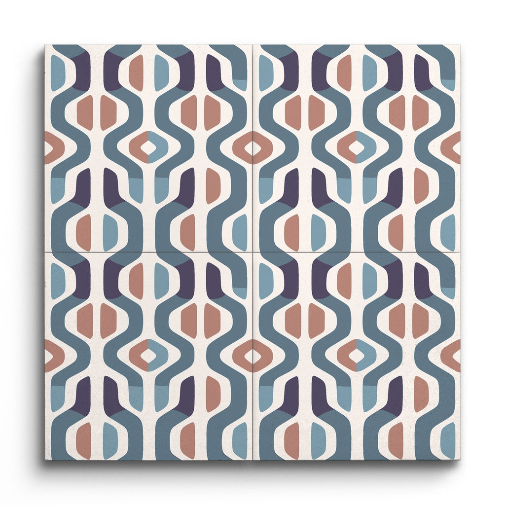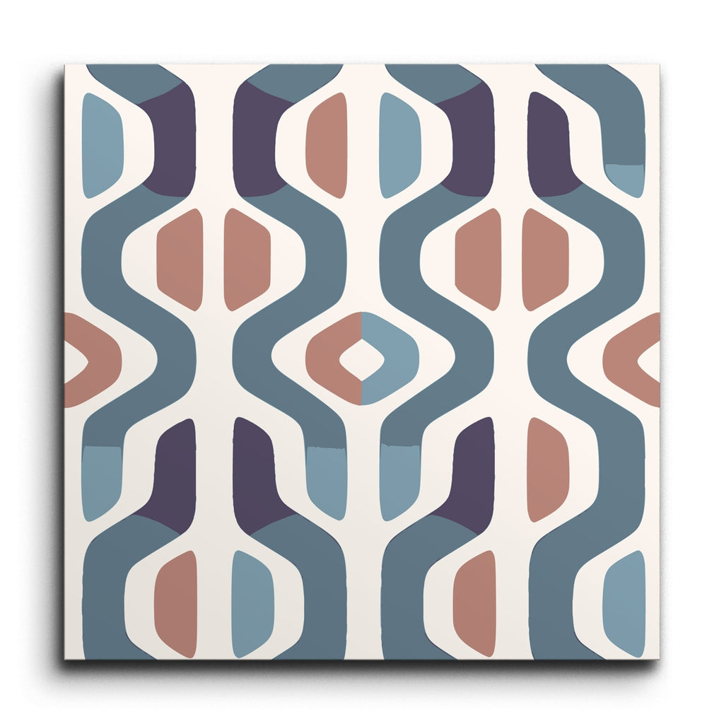 Ce carreau de décoration capture l'essence du style moderne du milieu du siècle avec son design géométrique saisissant. Son motif présente un jeu dynamique de formes abstraites, créant un flux rythmique qui attire le regard. La palette de couleurs, un mélange de bleus atténués, de bruns et de crèmes, évoque le charme nostalgique de l'époque tout en conservant une élégance intemporelle. Symétrie et équilibre sont au cœur de ce design, offrant un ajout harmonieux à tout espace.
