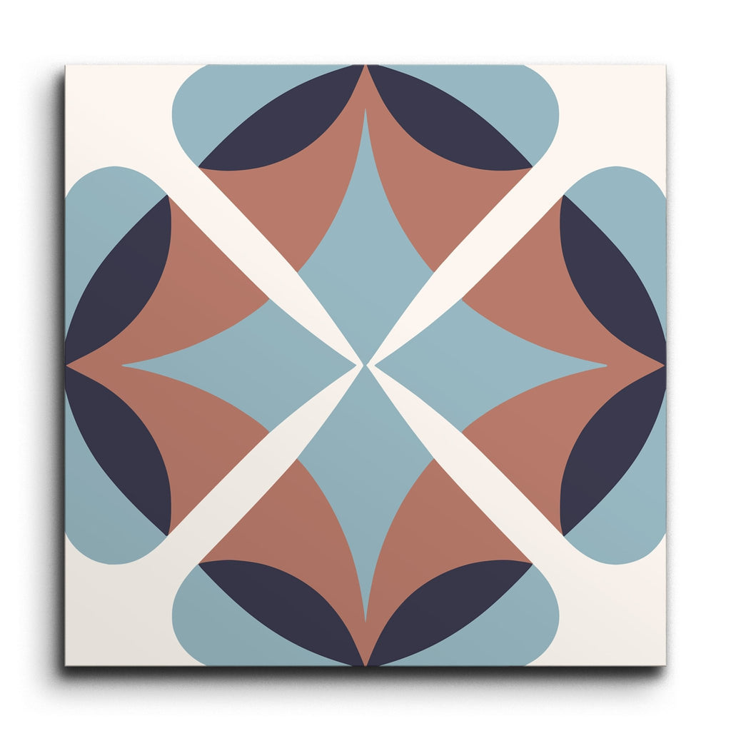 Ce carreau décoratif présente un motif géométrique captivant, alliant des formes symétriques avec des éléments à la fois courbés et angulaires pour un attrait visuel saisissant. Les teintes terreuses de brun, de bleu atténué et de bleu marine foncé contrastent magnifiquement avec un fond crème clair, créant un look audacieux mais harmonieux. C'est un choix idéal pour ajouter une touche de style moderne ou contemporain à n'importe quel espace.