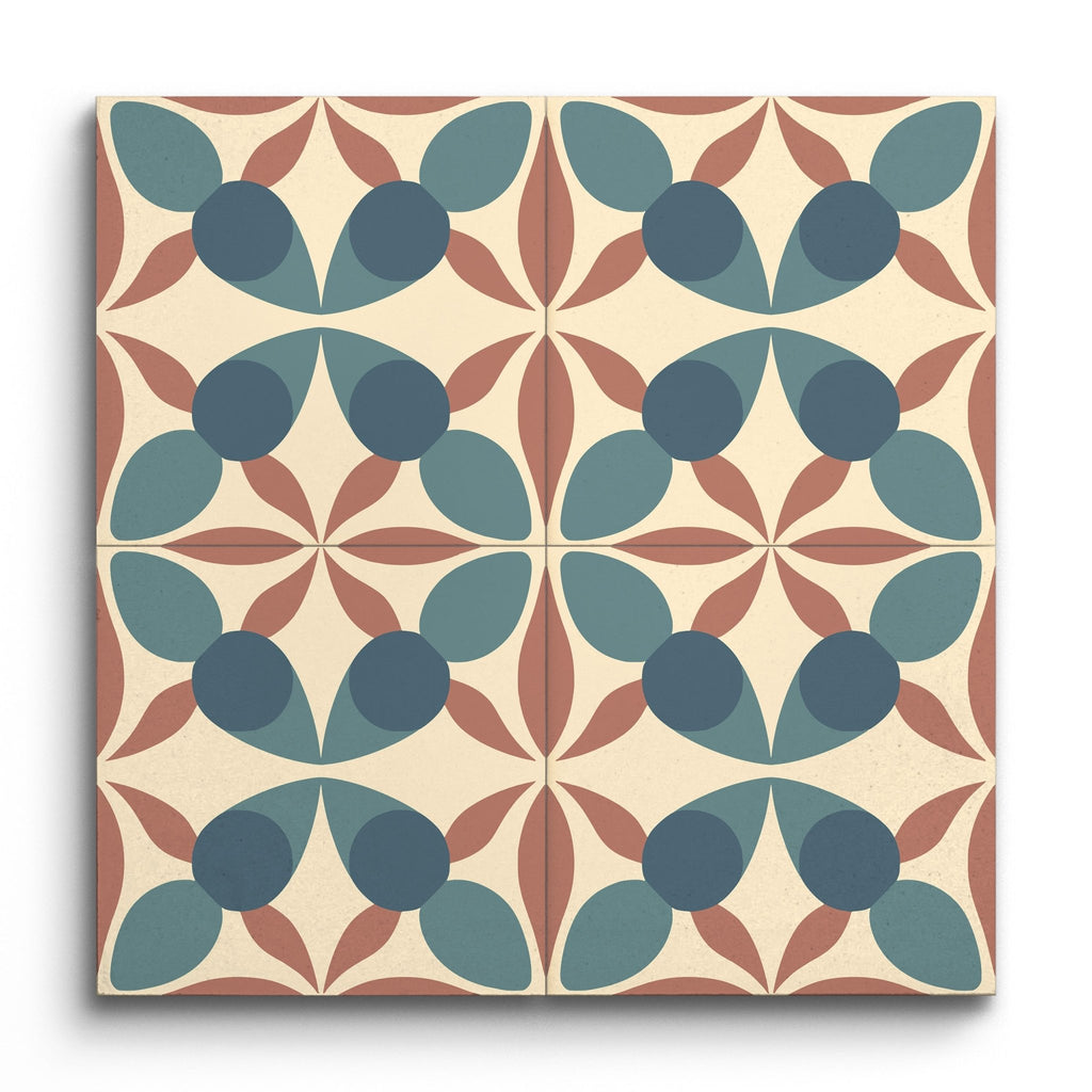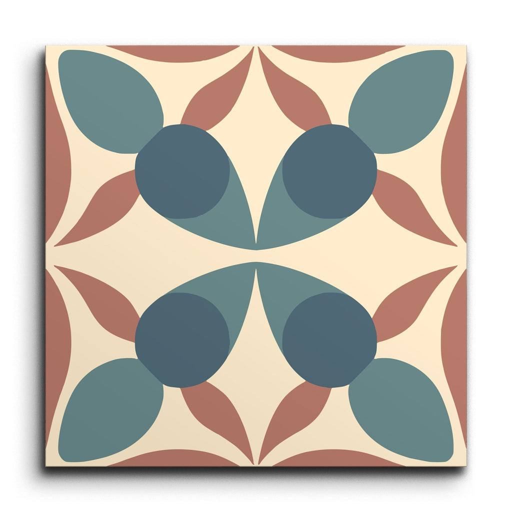 Ce carreau décoratif présente un motif géométrique captivant avec un mélange harmonieux de formes circulaires et en forme de feuille, disposées dans une disposition en miroir. Les couleurs bleu-vert atténué, brun terreux et crème douce créent une palette équilibrée et sereine, rehaussant le design épuré et structuré du carreau. Idéal pour ajouter une touche d'élégance, la symétrie et la simplicité du carreau en font un choix polyvalent pour tout espace.