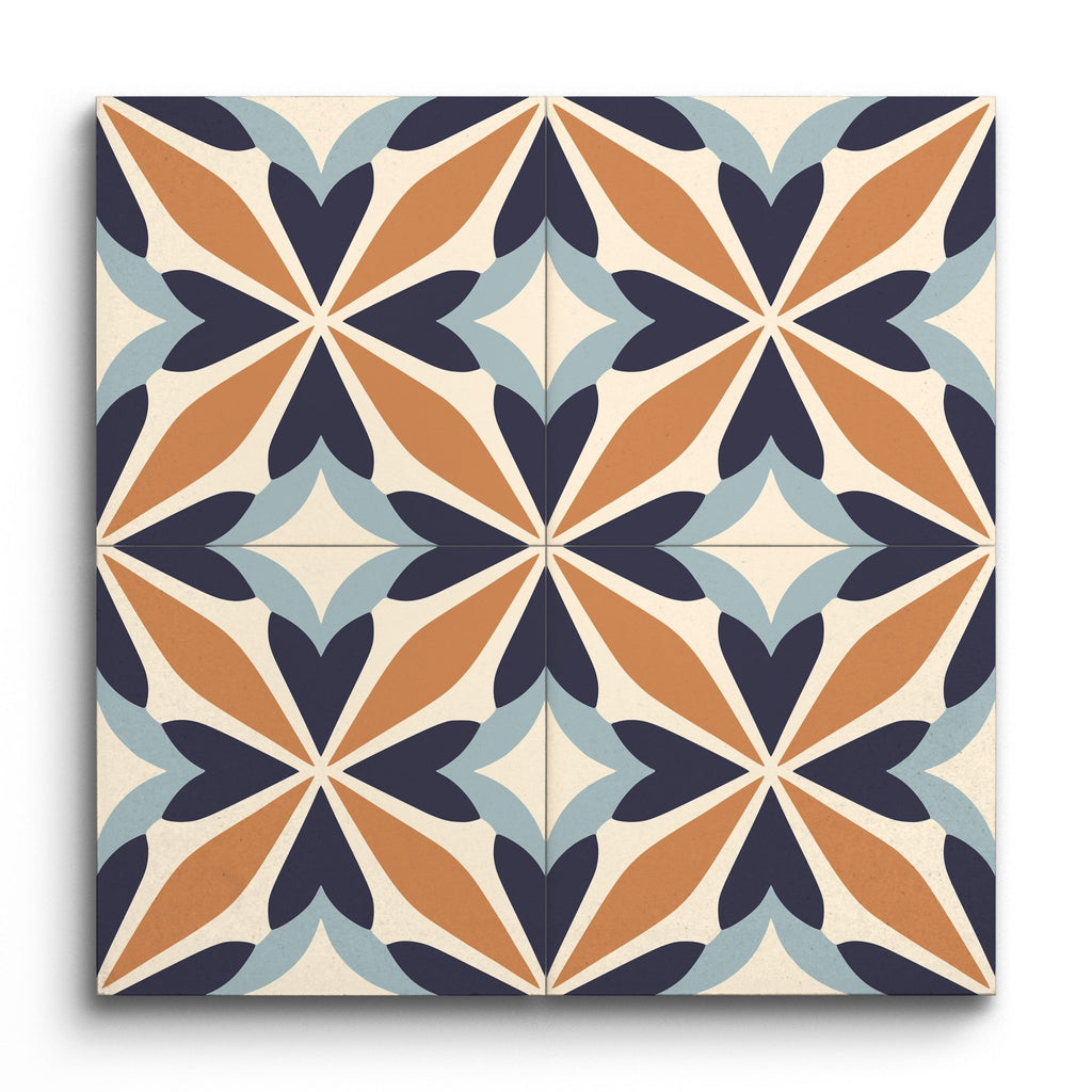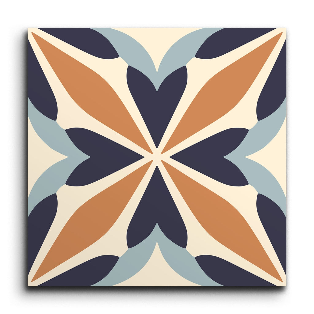 Ce carreau de décoration présente un motif captivant inspiré de l'encaustique, mettant en valeur un motif en forme d'étoile entrelacé avec des formes géométriques. Les tons terreux de terre cuite, de bleu marine et de bleu clair se détachent sur un fond crème doux, créant un mélange harmonieux de couleurs. Son design équilibre sans effort le charme classique avec une touche moderne, offrant une esthétique intemporelle qui complète une gamme de styles d'intérieur.