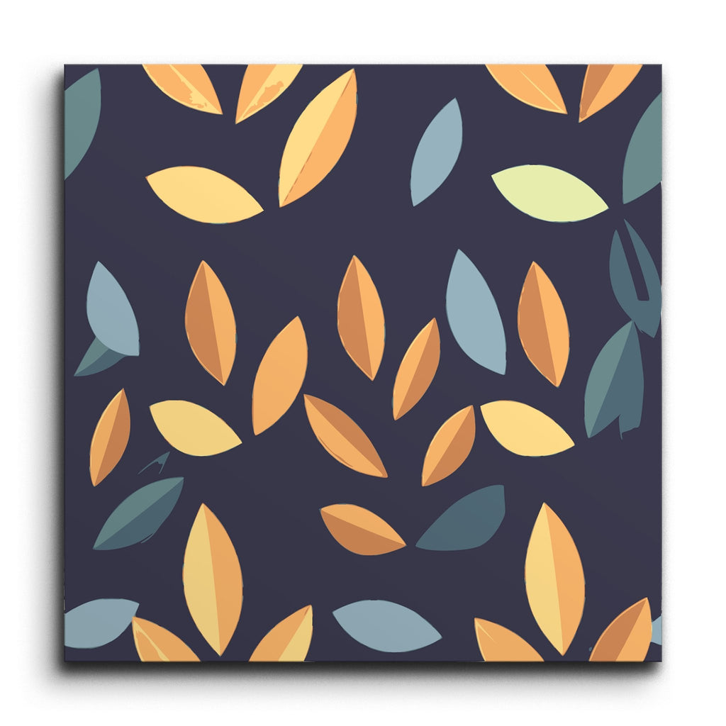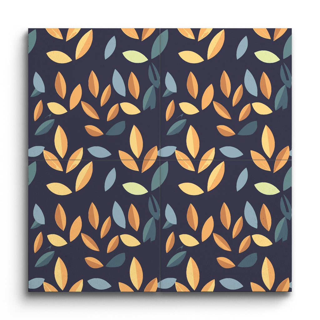 Ce carreau décoratif présente un motif géométrique dynamique orné de formes de feuilles stylisées qui semblent danser sur sa surface. La palette de couleurs vibrante combine des nuances d'orange, de jaune, de sarcelle et de vert clair, le tout sur un fond bleu profond. Cela crée un contraste saisissant qui donne vie au design. Avec son esthétique moderne et ludique mais structurée, ce carreau apporte une touche vivante à n'importe quel espace.
