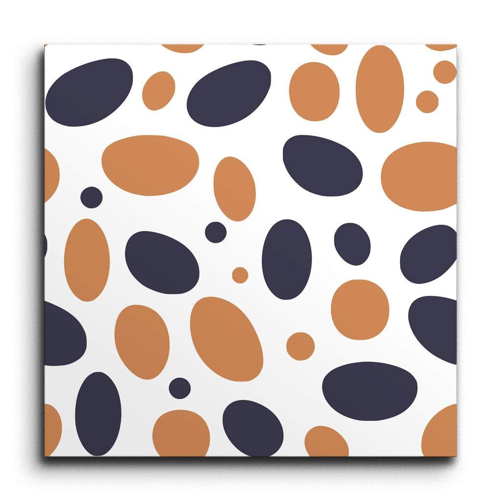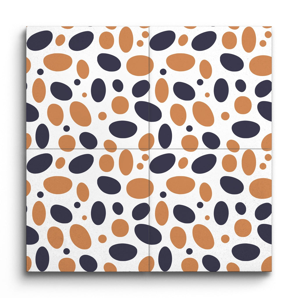 Ce carreau de décoration présente un design moderne captivant avec son agencement ludique de formes ovales irrégulières en bleu marine foncé et terre cuite chaude. Ces couleurs contrastées se détachent sur un fond blanc éclatant, créant un motif dynamique et accrocheur. Le design minimaliste, caractérisé par sa simplicité et ses lignes épurées, incarne l'essence du style moderne. Les formes géométriques et la palette de couleurs limitée contribuent à son esthétique audacieuse, en faisant un choix polyvalent pour divers espaces intérieurs.