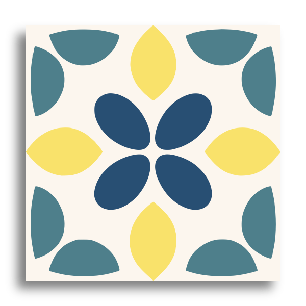 This decor tile showcases a harmonious blend of oval and leaf-like forms, arranged in a symmetrical geometric pattern. The modern, minimalist design is accentuated by a soothing palette of soft blues and yellows set against a crisp white background. This combination offers a fresh, balanced aesthetic that brings an organized and clean look to any space.