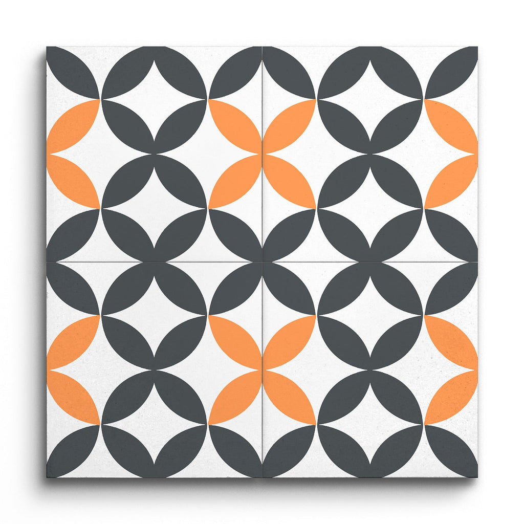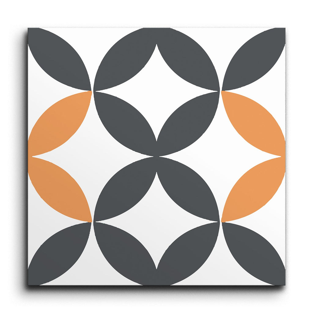 This decor tile showcases a captivating geometric pattern that effortlessly draws the eye. Dark gray and orange petal-like forms interlock in a symmetrical, repetitive design, creating a harmonious circular arrangement on a pristine white background. The clean and modern aesthetic, highlighted by the contrasting colors, brings a dynamic and vibrant energy to any space. The bold and visually striking pattern exemplifies the essence of geometric styles, celebrating shapes and structure with a contemporary touch.