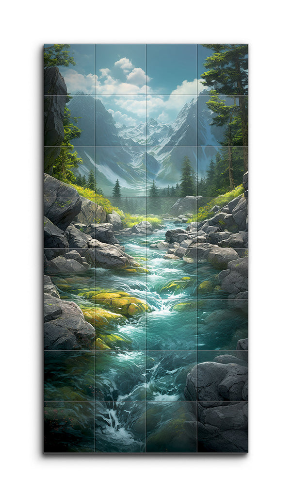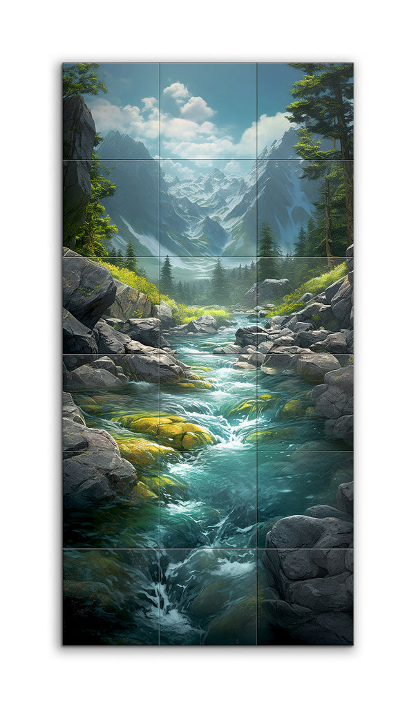 Cette fresque de carreaux présente un paysage montagneux serein avec un ruisseau cristallin traversant un terrain rocheux, créant de petites cascades et des rapides. Les bleus et verts vibrants de l'eau suggèrent sa pureté et les pierres couvertes de mousse en dessous. Des rochers et des blocs rugueux ajoutent de la texture, tandis qu'une prairie luxuriante avec de l'herbe et des buissons se transforme en grands arbres à feuilles persistantes détaillés. Des montagnes enneigées s'élèvent majestueusement en arrière-plan, leurs sommets enveloppés de brume. Le ciel bleu clair avec des nuages duveteux suggère une journée tranquille et agréable.