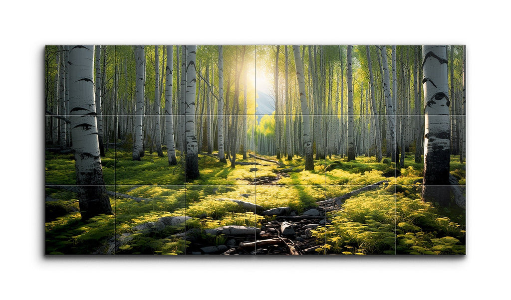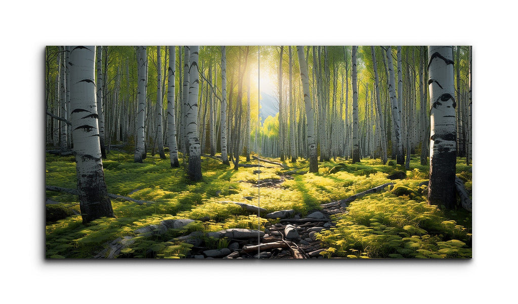 L'œuvre d'art capture une scène forestière tranquille, mettant en valeur de grands bouleaux avec une écorce blanche distinctive et des marques noires parmi des feuilles vertes vibrantes. La lumière du soleil filtre à travers le feuillage, créant un motif tacheté de lumière et d'ombre sur le sol forestier moelleux, qui est parsemé de pierres et de branches tombées. La source de lumière, probablement un lever ou un coucher de soleil, projette une lueur chaude et dorée, conférant une qualité sereine et éthérée à la scène. Le style détaillé et réaliste souligne la beauté naturelle et la paix de la forêt.