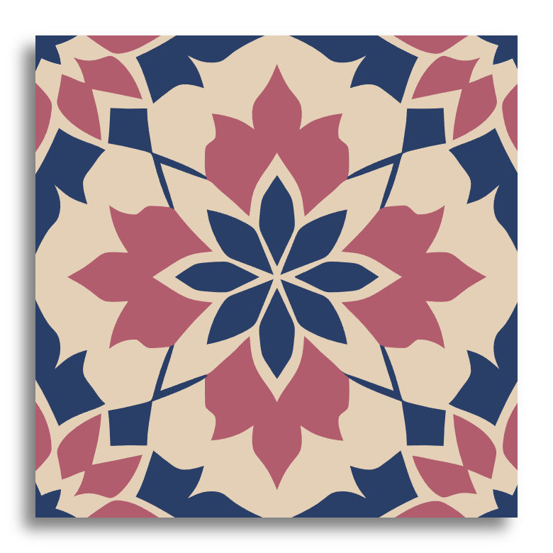 This enchanting decor tile captures the essence of traditional craftsmanship with its symmetrical, floral design centered around a star-like motif. A harmonious blend of dark blue, terracotta, and off-white hues creates a striking visual contrast that draws the eye. The intricate, repeating pattern is reminiscent of vintage encaustic tiles, evoking a sense of history and timeless elegance. Perfect for adding character and charm, this tile is a versatile choice for enhancing any decorative space.