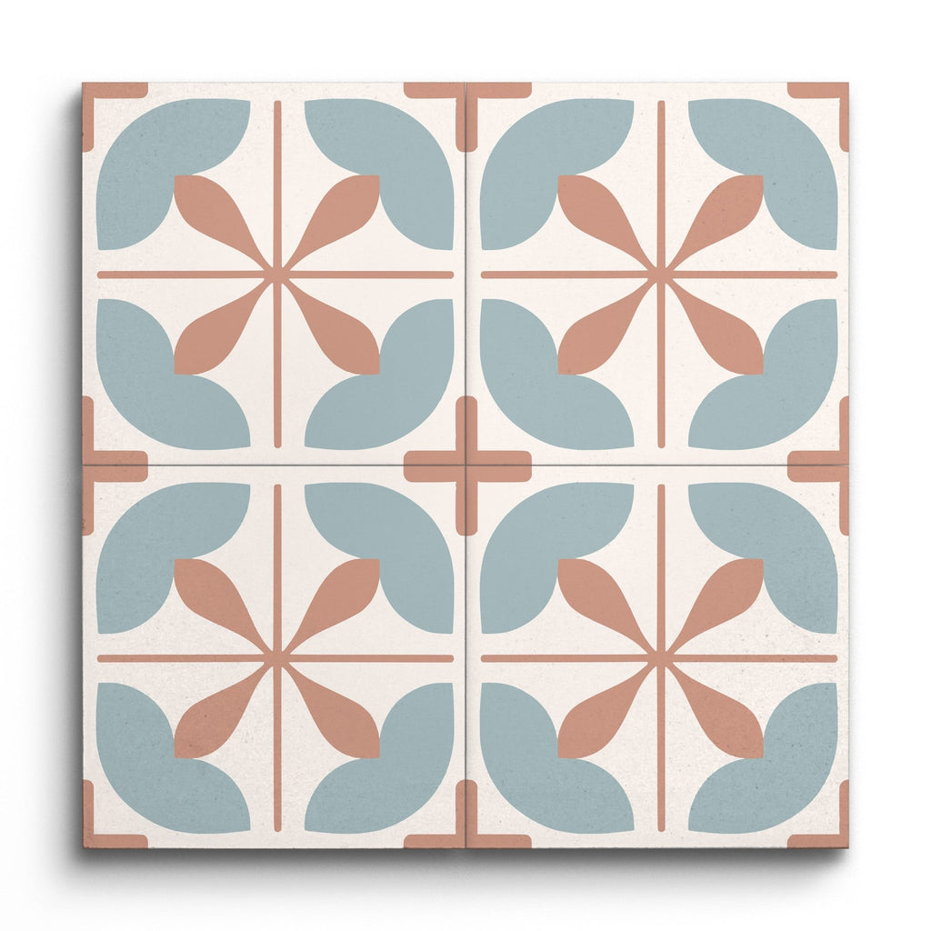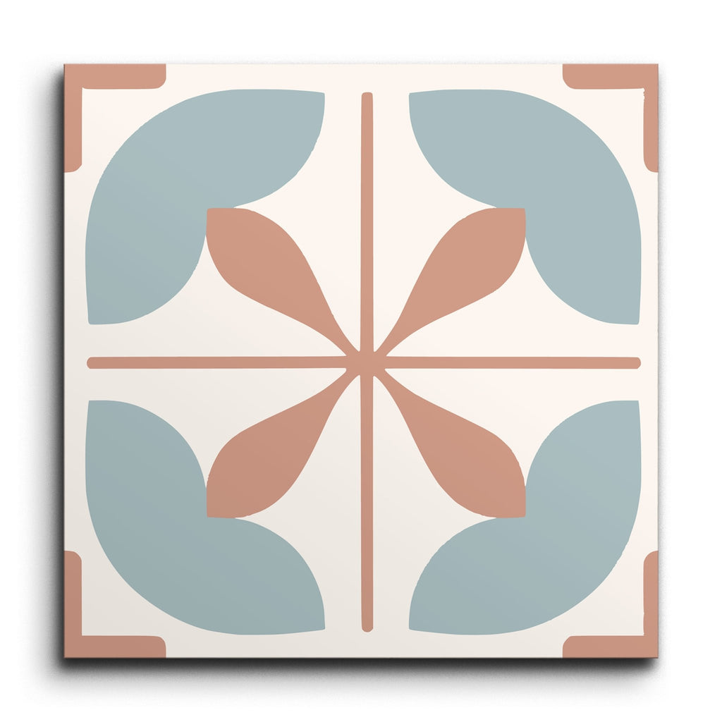 Ce carreau de décoration présente un design symétrique qui allie harmonieusement formes géométriques et organiques. En son centre, quatre motifs en forme de feuille rayonnent vers l'extérieur, créant un aspect à la fois équilibré et harmonieux. La palette de couleurs du carreau comprend des tons de bleu doux et de terracotta chaleureux sur un fond crème, offrant un charme vintage avec une allure intemporelle. Inspirée par les carreaux encaustiques traditionnels, cette pièce évoque une sensation d'élégance et d'artisanat, idéale pour ajouter du caractère à n'importe quel espace.